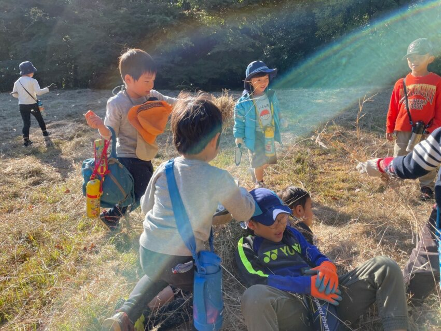 朝の受付をしてから早速森の中へリーダーと一緒に入っていき、どんぐりを探したり、木登りをしたりと、活動のスタートする時にはズボンにひっつき虫をたくさんつけた様子の子どもたち。