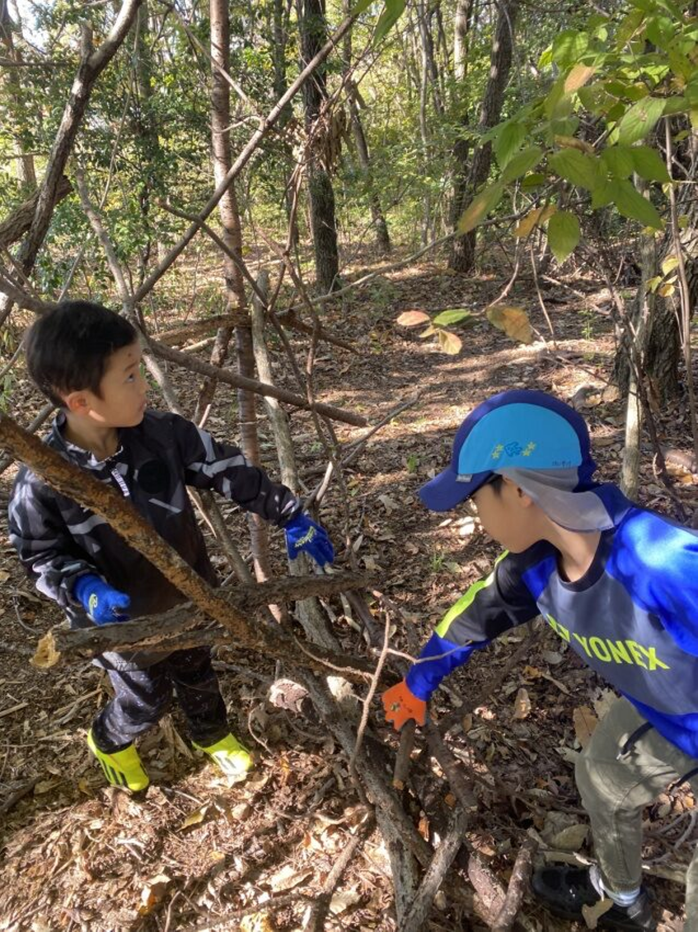 今回は、森の中で木登りや木のブランコ、秘密基地作り、山探検などいろんな遊びをしていきました。