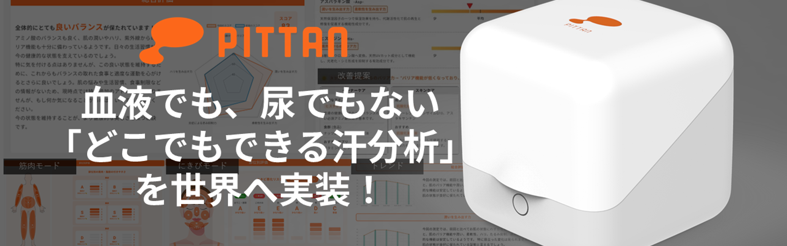ごく微量の汗中の生体物質を分析するという革新的な技術開発とサービス提供を高い技術力を駆使して実現しています。更に小型装置の開発によって、「低コスト・非侵襲、感染リスクなし」のオンサイトでの分析を誰でも何処でも何時でも可能にします。これによって人々が自身の細胞の状態を把握できることで、体に関する制約を適切に解消できる社会の実現を目指しています。