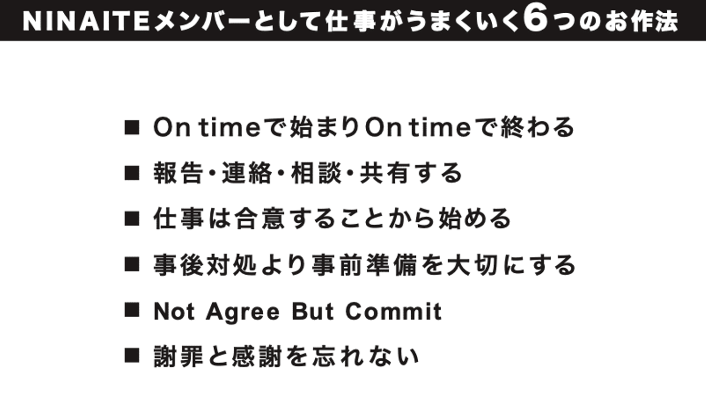 大事にしている本質は変わりませんが、「NINAITEメンバーとして仕事がうまくいく6つのお作法」(以下「仕事のお作法」)が追加されました。
