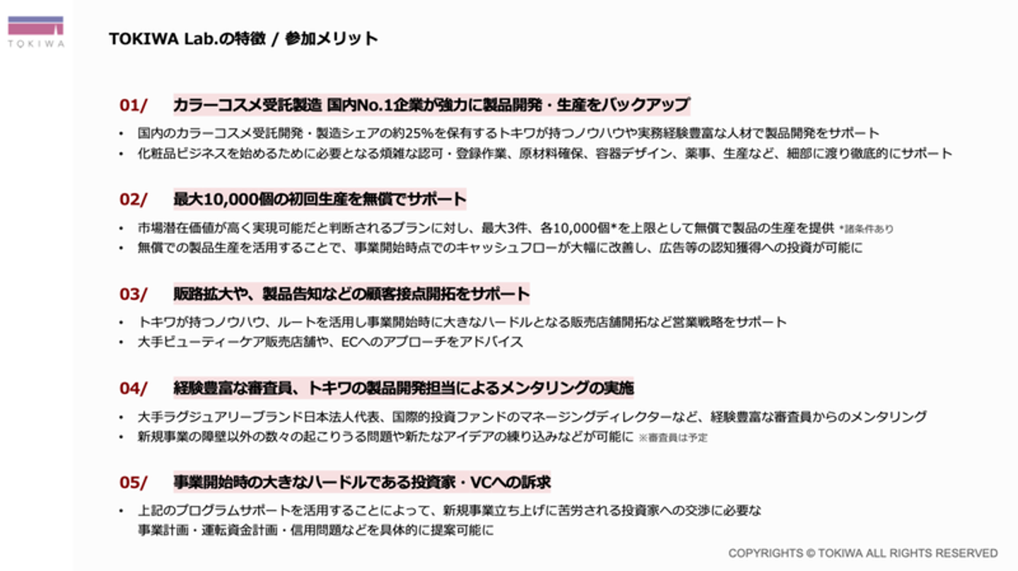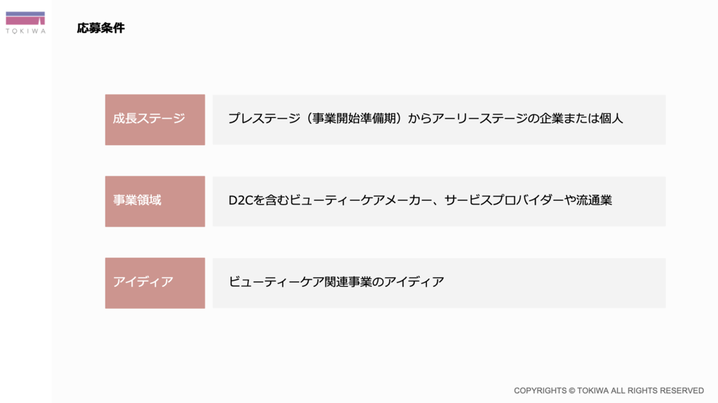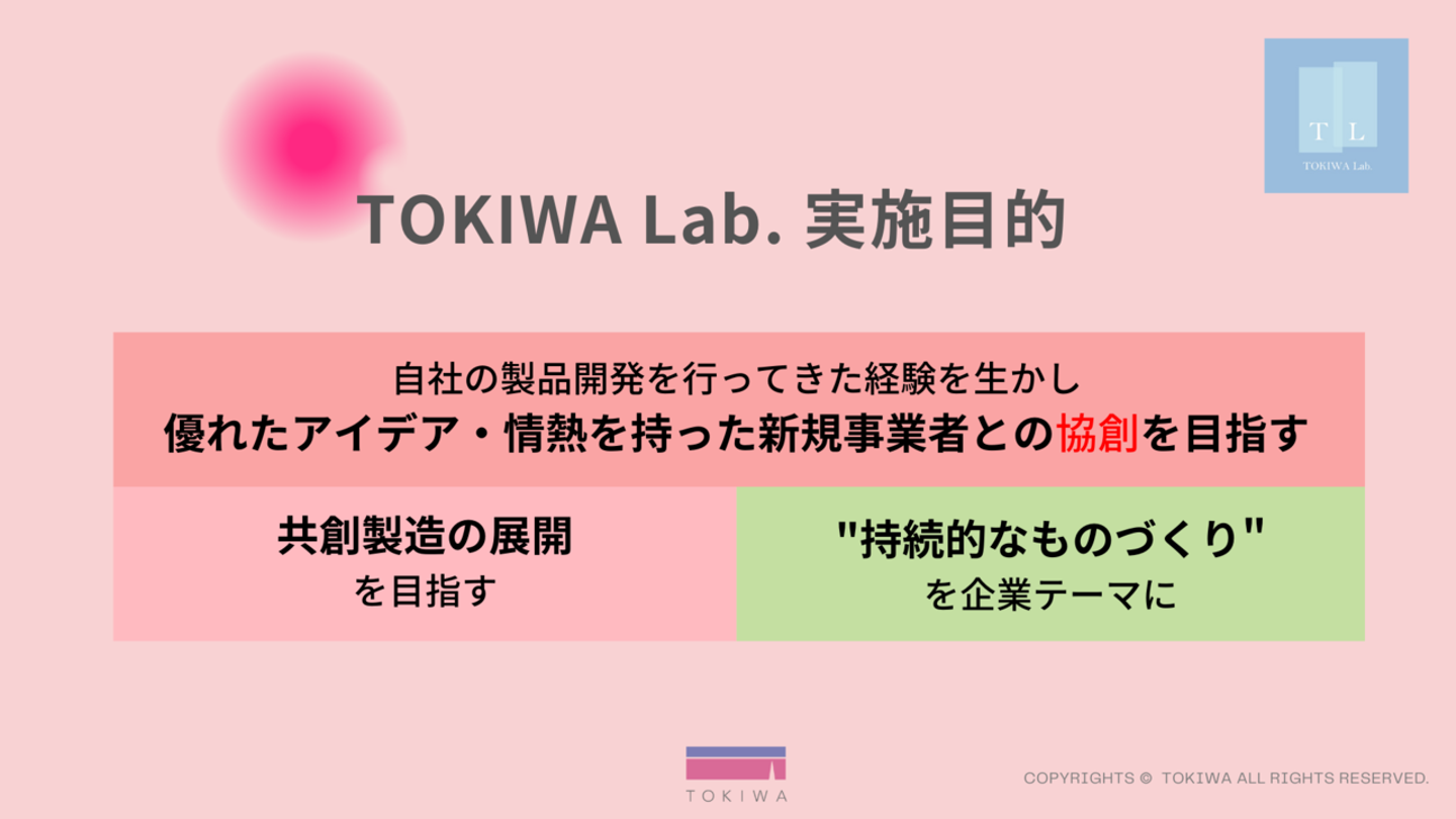 株式会社トキワは現在、昨年に引き続き、スタートアップ企業やその他ビューティに関わる幅広い分野の方を対象とした開発支援プログラム「第2回トキワアクセラレータープログラム『TOKIWA Lab.』」を開催しています。