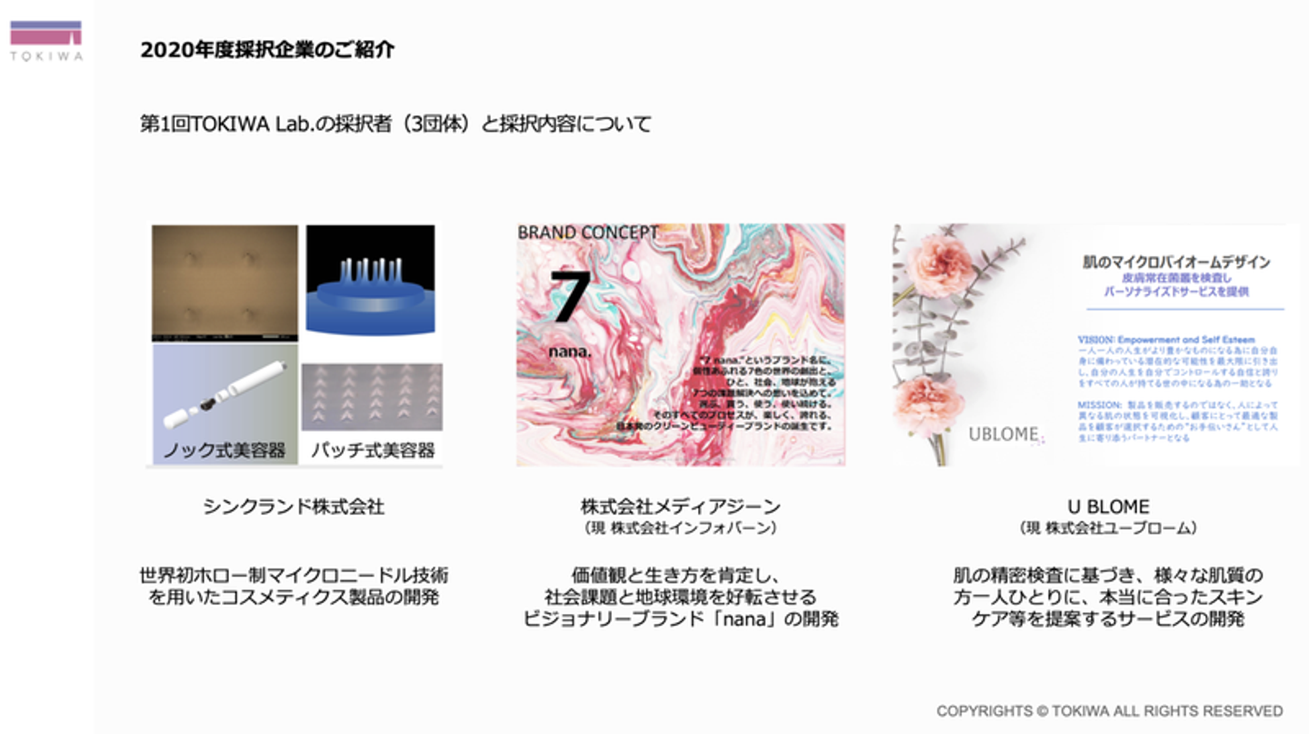 第1回TOKIWA Lab.では、以下の3社が採択されました。