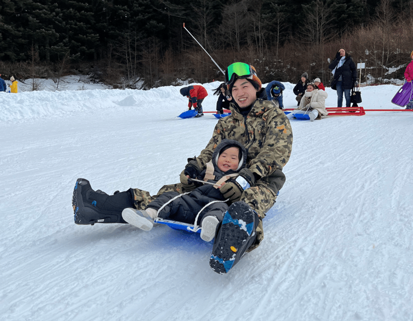 スノボ旅行で人生初めてのソリを楽しむ息子