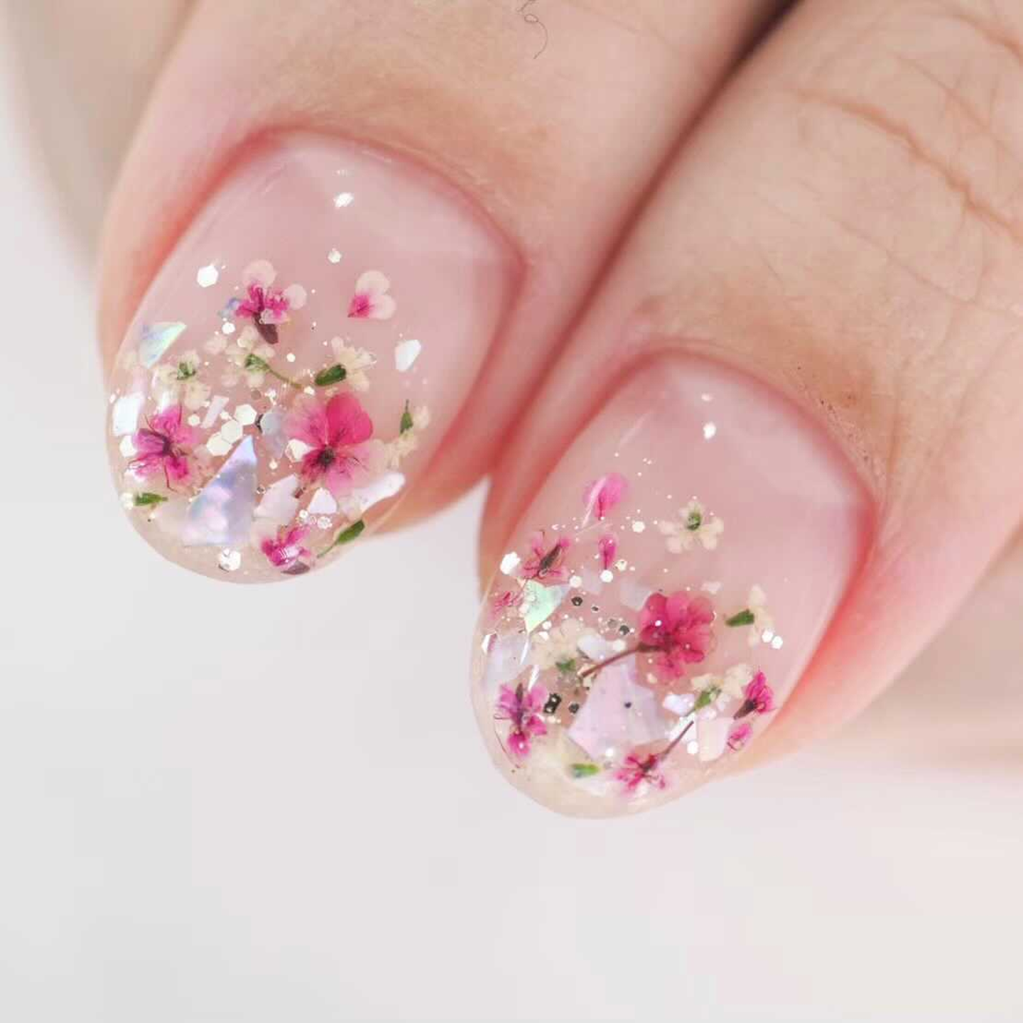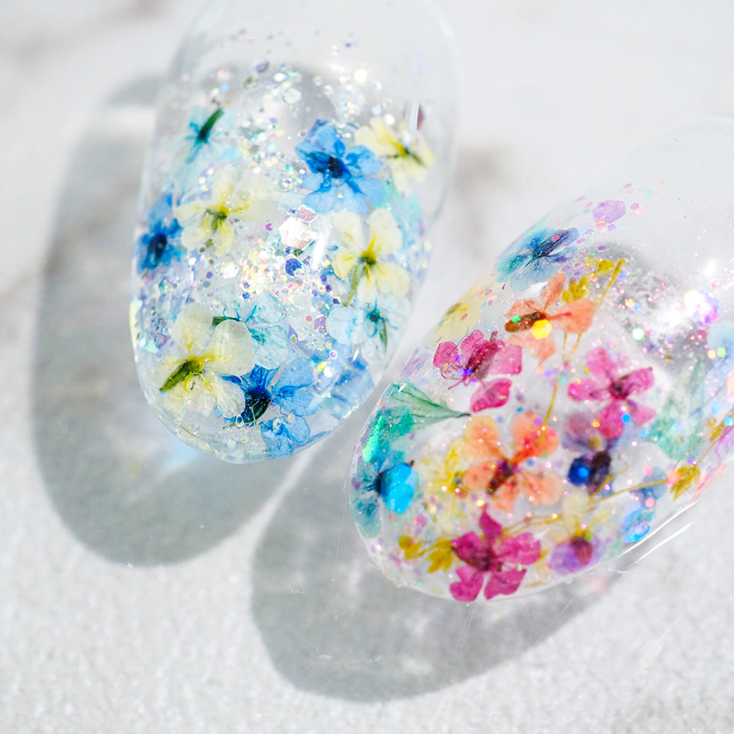 もちろんその頃は、商品として販売する予定はなく、ただ自分が納得のできるようなクオリティの押し花が欲しいという思いだけで、生のお花を購入し、何百回と試行錯誤を繰り返す日々でした。そしておよそ1年後、ようやく最高の押し花を完成させることができました!自分の満足度はもちろんのこと、これでお客様に最高に可愛い押し花ネイルを発信できることにワクワクが止まりませんでした。あえてムラのある自然な染まり方や、単純な原色ではない絶妙なカラー。お花の形を残しながらもしっかりと薄くプレスされた状態。国産のお花ならではの品質。どこにも妥協しない、最高の押し花です。