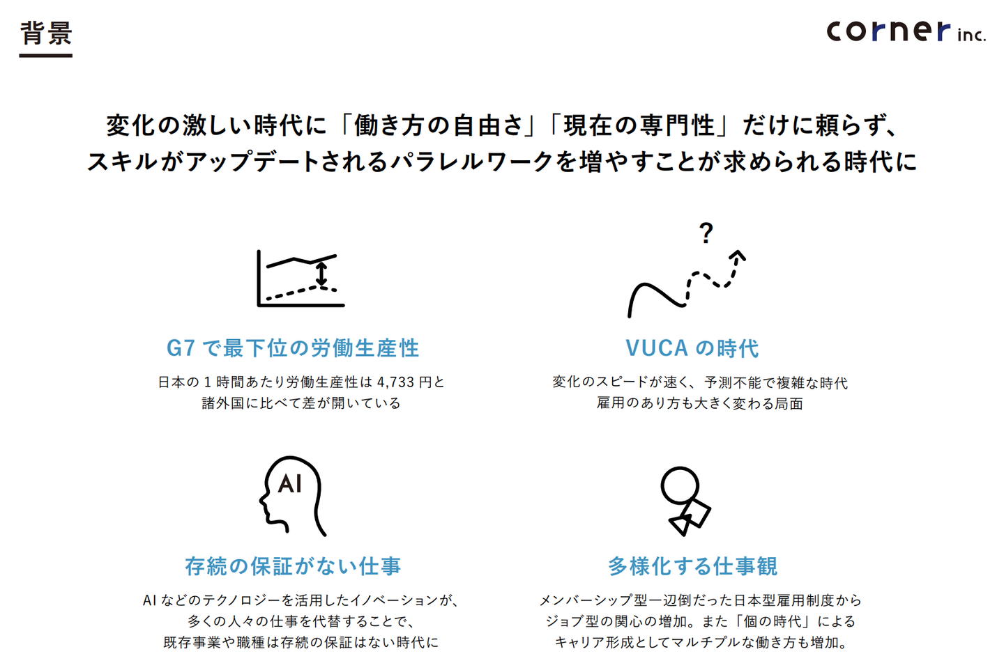 今回は、コーナーが手掛ける「パラレルワーカーシェアリングサービス」のマーケットや取り組み背景についてご紹介しました。まだまだこれからの新しい領域ですが、パラレルワーカーという選択肢を誰もが選べる世の中にするためにも、引き続き取り組んでいきます。