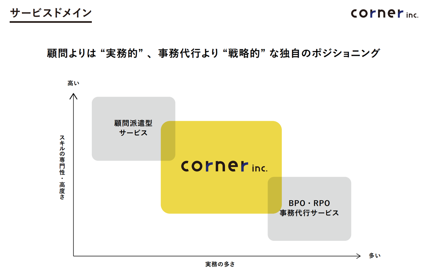 サービス開始時、専門領域に知見を持った顧問派遣型サービスや、事務代行がメインのBPO・RPOサービスなどは存在しましたが、ちょうどそれらの間にある「企画や戦略の絵を描きながらも、ハンズオンによる実務支援ができるサービス」というものがほとんど無いように感じていました。