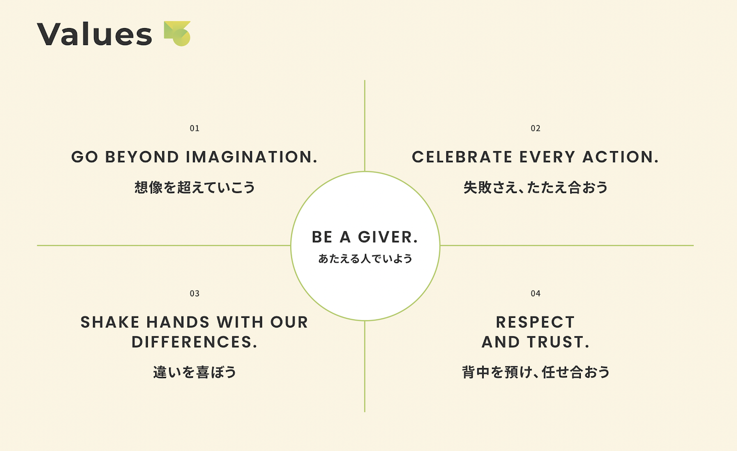 約1年前にValuesを社員全員で考えていたとき、「こうありたいね」「こういうあり方はコーナーっぽいね」とすんなり決まったのが01〜04のValuesでした。逆に「BE A GIVER」に関しては、当初私たちにとって当たり前すぎてValuesに入れるまでもないのでは?という意見が多く出ました。