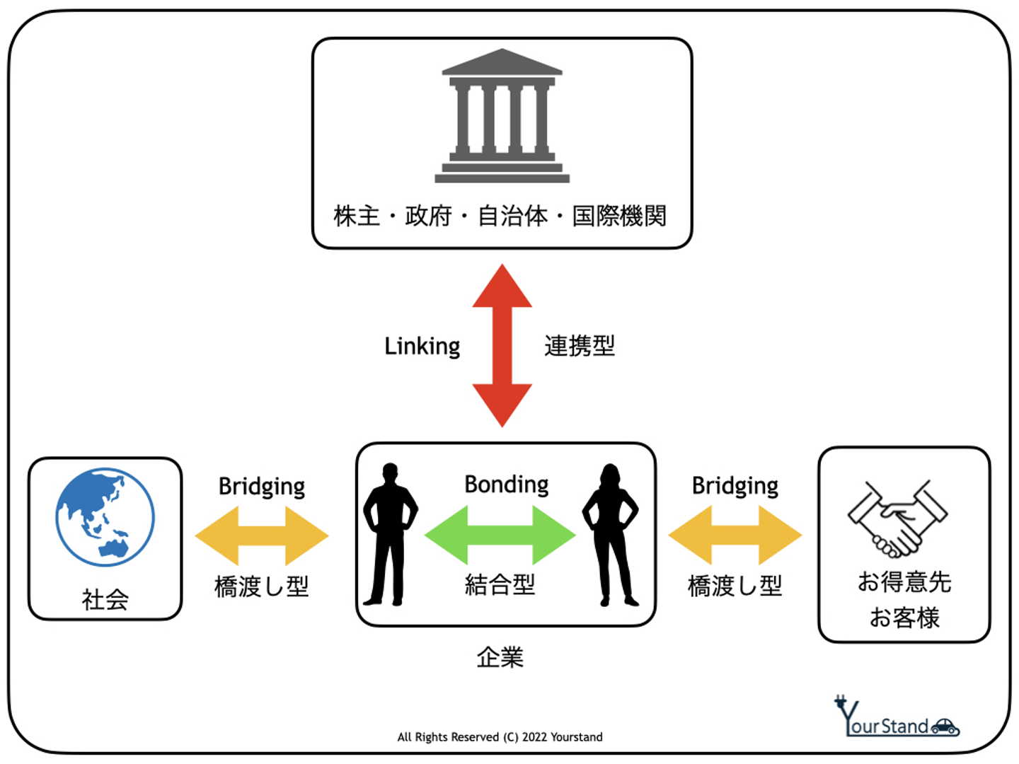 そして、最後に企業と株主や、企業と政府との関係性はある意味階層が違うので、連携型のソーシャルキャピタルになる。