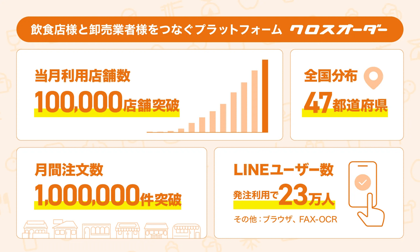 クロスオーダーは、飲食店様と卸売業者様をつなぐプラットフォームです。FAXや電話が主流だった受発注業務をスマートフォン上のLINEに切り替え業務効率化を推進するクロスオーダー受発注」、LINEを活用したオンライン販促機能「クロスオーダー販促」、電帳法に対応した請求書DX機能「クロスオーダー請求書」など、飲食店様と卸売業者様のあいだのアナログな業務をデジタル化する機能を次々と展開しています。2019年11月のサービス提供開始から5年で、当月のアクティブな利用店舗数は100,000店舗を突破しました。