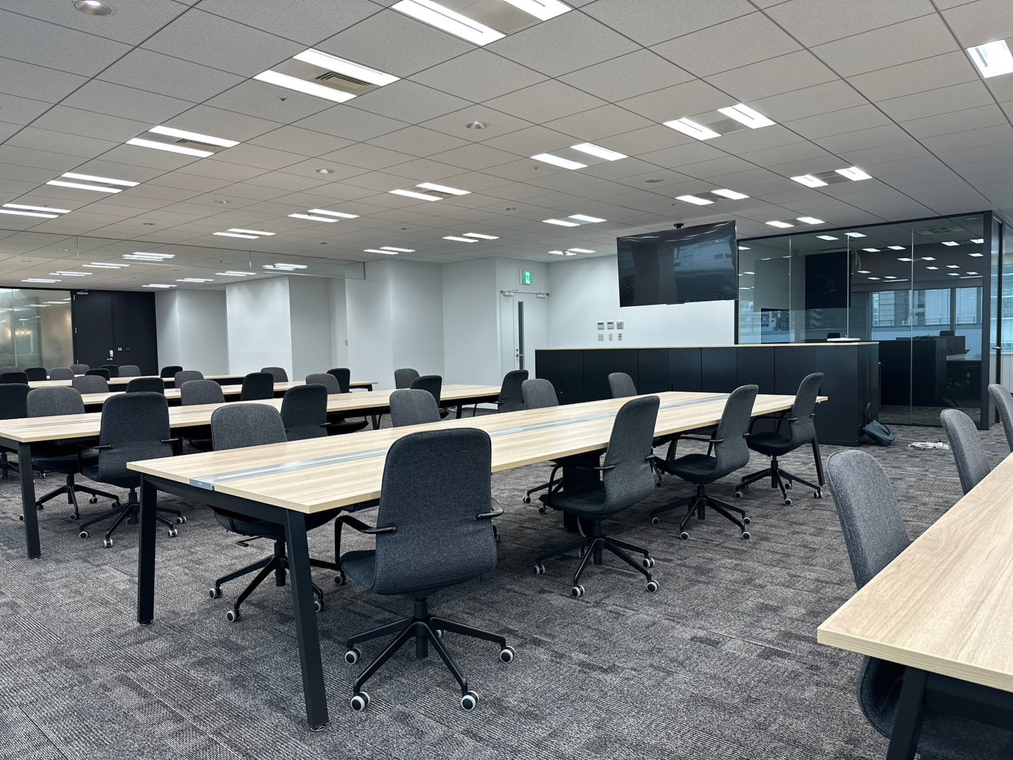 こちらでは受託開発部の社員がお仕事をしたり、毎月の中途入社の新人研修の会場として使用したりしています。
