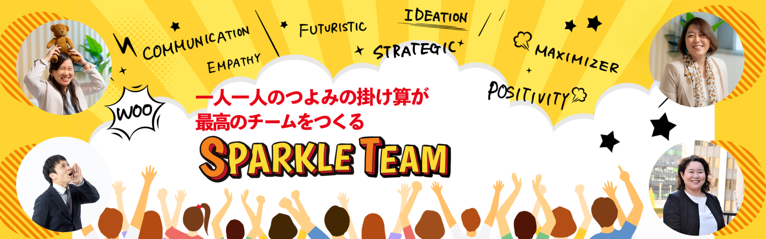 スパークルチーム=一人一人が強みを活かし合い、1+1=∞なコラボレーションを生む職場を増やしたい。 米国ギャラップ社「グローバルワークプレイスの現状2023年版」によると、「従業員エンゲージメント」の強い社員は、日本は2年連続5%、世界124位。この10年弱で日本の働く人の幸せ度はまったく高まっていないのが現状です。 どうせ働くなら、ワクワク働いてワクワクを生み出すチームでありたい。それが私たちの願いであり、Purposeです。