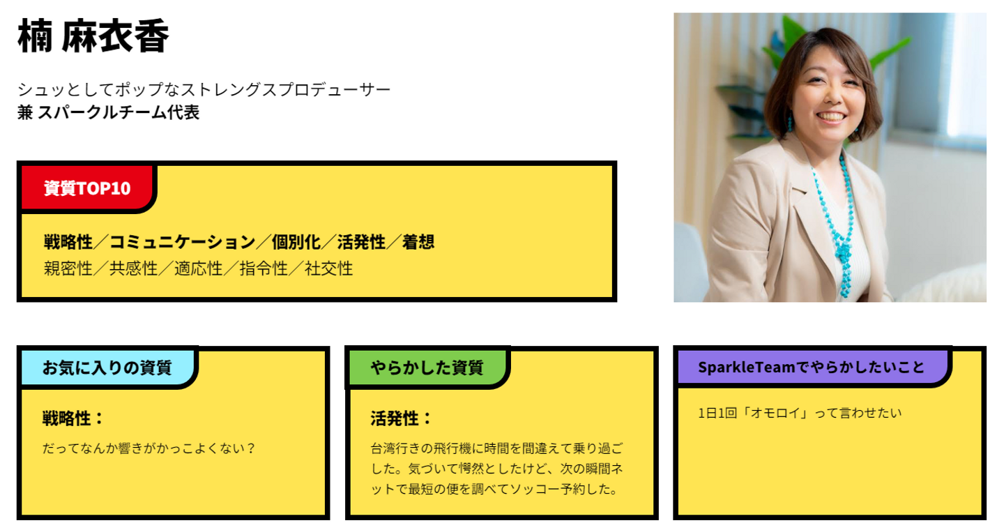そんな時に、ひょんなことからストレングスファインダーに出会いました。 診断してみたところ、私の上位資質は「戦略性・コミュニケーション・個別化・活発性・着想」で、その資質(つよみ)を紐解くと、「誰も思いつかないようなやり方を思いついて周りを巻き込み、風穴をあける」「一人一人の個性を見抜いて生かす」「言葉で人を魅了する」というものでした。
