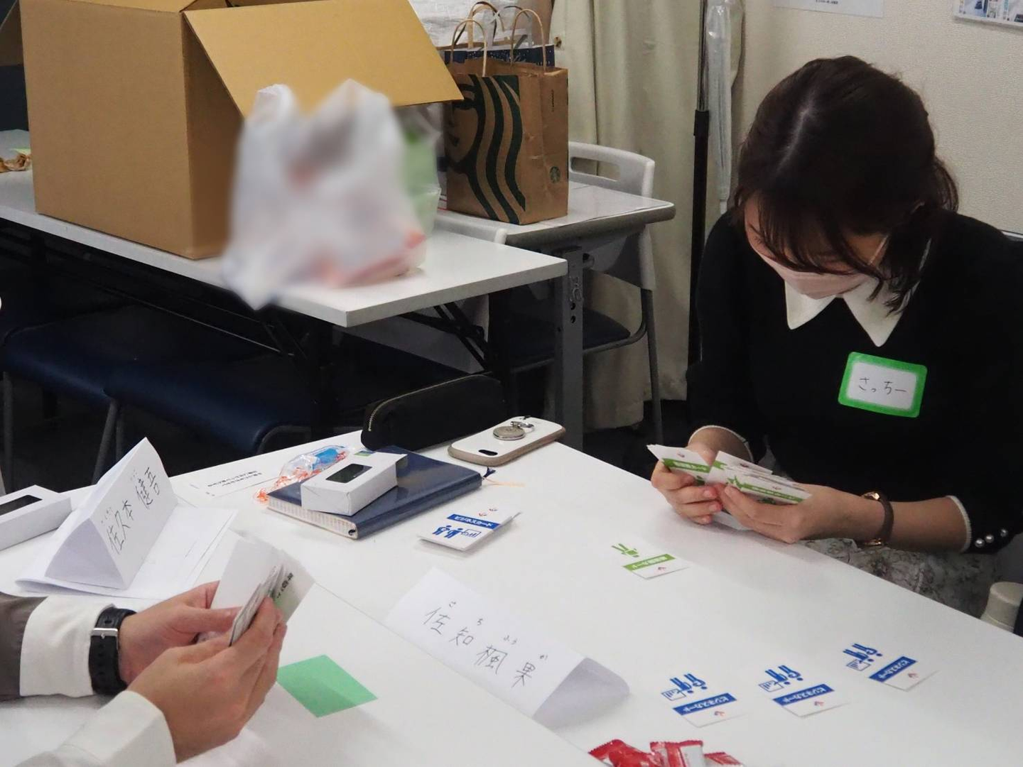 - 48枚の「質問カード(ビジネスカード)」から1枚引き、書かれている質問(例:『学生時代一番印象に残っていること』)に対して、参加者が答えを考える
