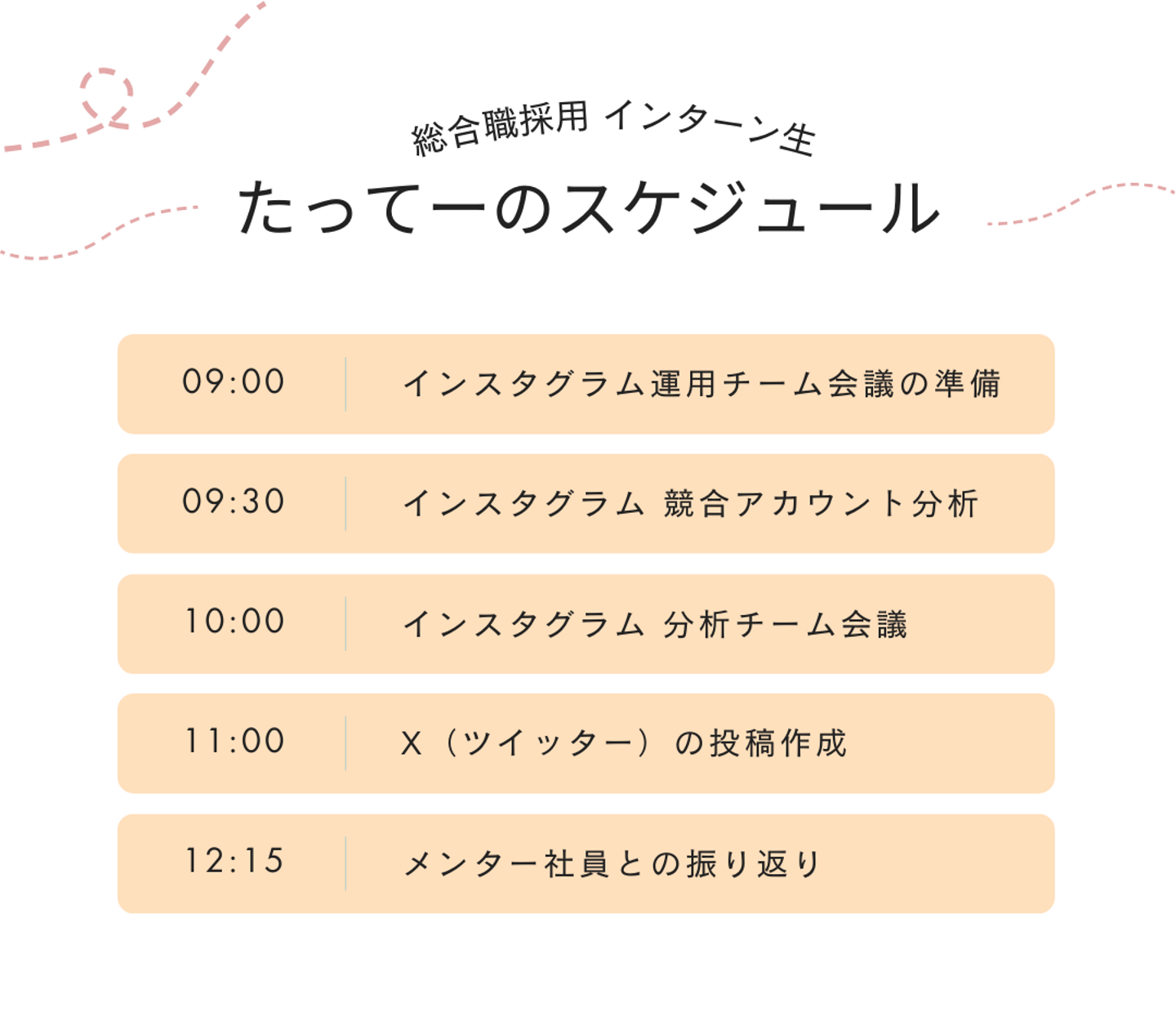 たってー:私もそんな感じ!あとは、定期的にメンターさん(※)と振り返りの面談を組んでもらっています。担当している業務について整理をしたり、普通に雑談したりすることもあります!社員さんとの距離が縮まっている感じがして嬉しいです。