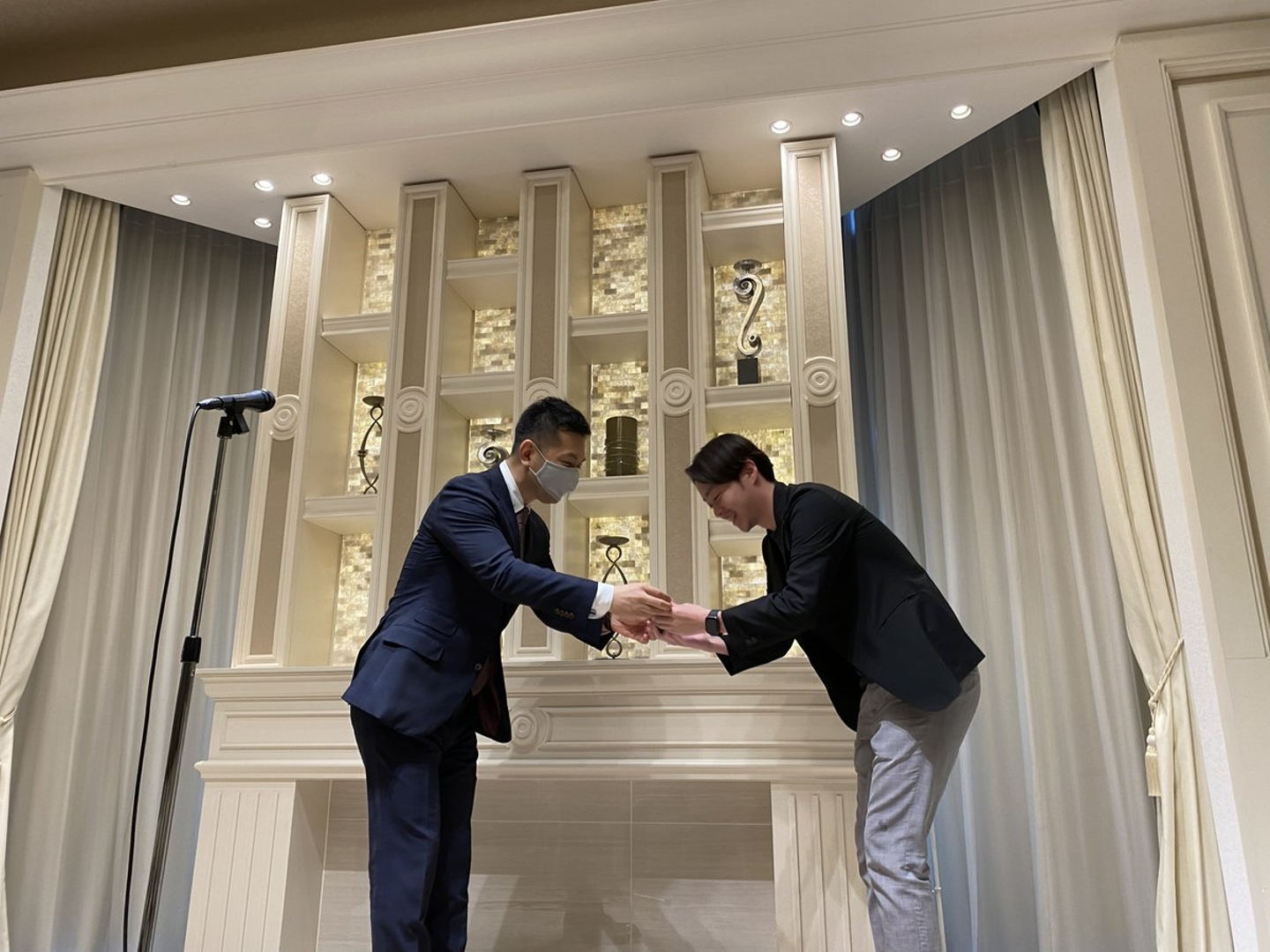 亮さん(代表。あだ名で呼び合う文化です)からトロフィーを受け取るとってぃさん