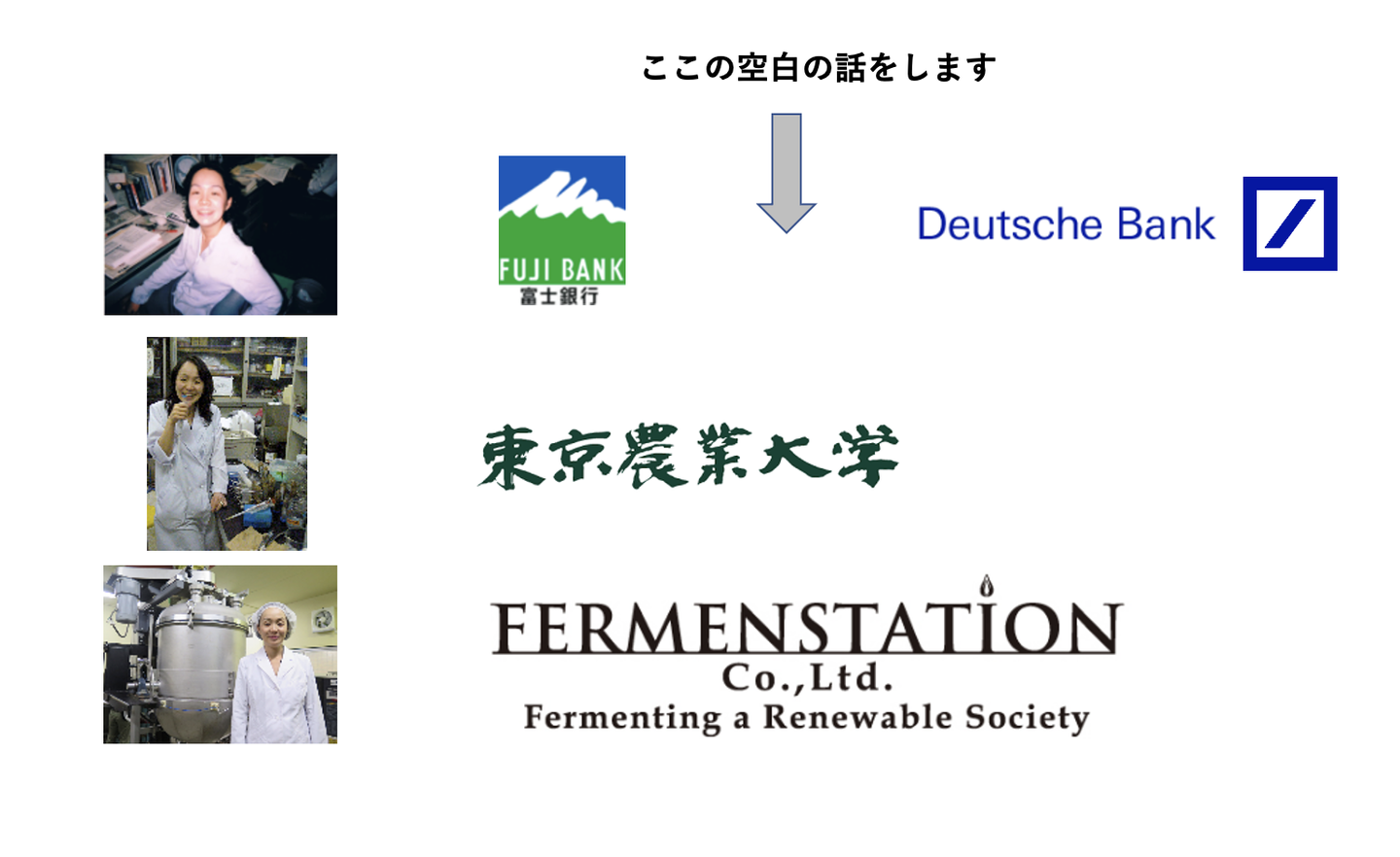 「金融機関で10年間勤務、ある日テレビを見て生ゴミから燃料(エタノール)を作る技術があることを知り、それにチャレンジしたくなり東京農業大学に入学、そこでのご縁などをきっかけに2009年にファーメンステーション創業。」