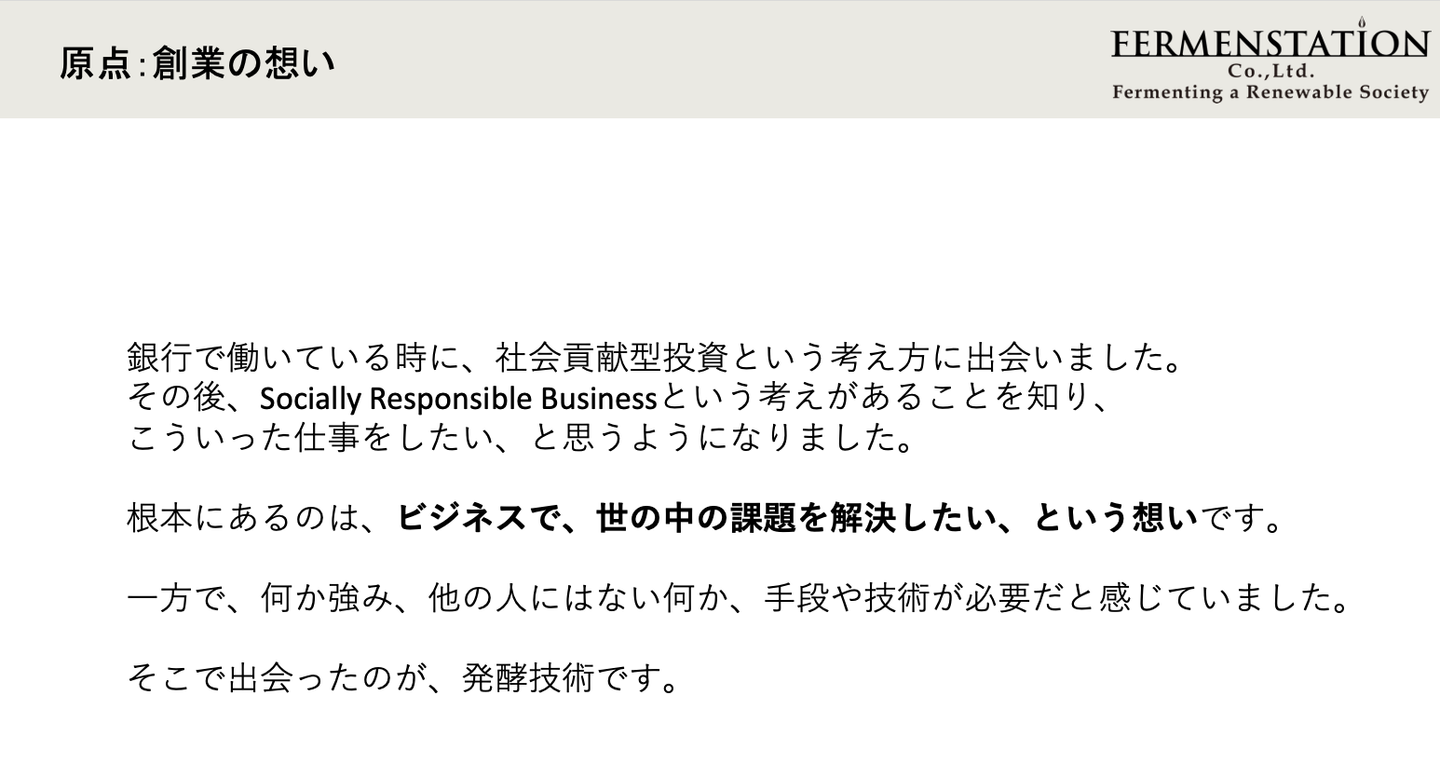 「社会の課題に取り組む手段としてビジネスは有益だと思っています。まだ理解されないかもしれませんが、そういうチャレンジをしたいと考えていて、発酵技術はその実現に必要なものだと感じました」と答えたことを覚えています。