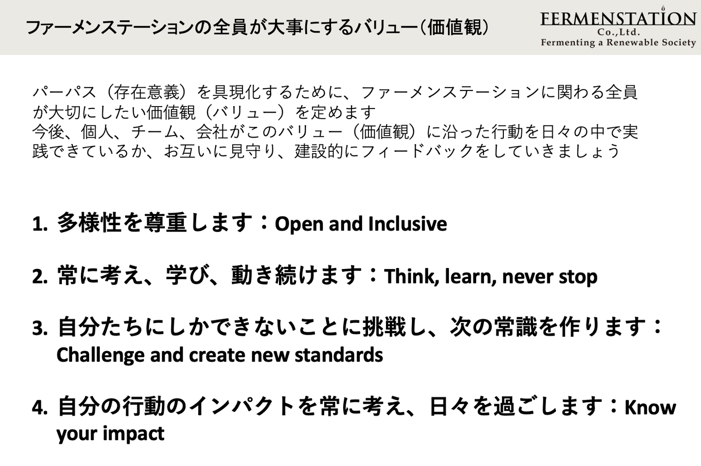 これまで、少人数でやってきたことで、はっきり言わなくても通じるよね、みたいなこともあったのですが、メンバーも増え、これから成長していく中で、ファーメンステーションに関わる全員が大切にしたい価値観を決めました。これも、メンバーに意見を聞いたり、アンケートのようなものをとったりしながら決定したのですが、思いの外、というかメンバーが考えていることが非常に近くて、驚いたり、嬉しかったり、心強く思ったりしました。
