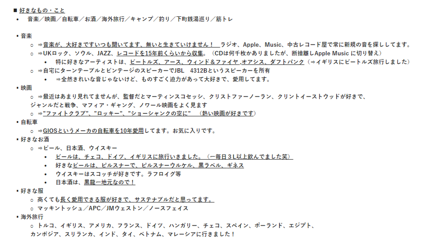 Wantedlyでコンタクトして、最初の面接は確かオンラインで酒井さん(代表)・北畠さん(COO)とお話ししました。次の面接は訪問してお話しすることになったのですが、「次回は事業についてディスカッションしましょう」というお話だったので、スライドを準備していきました。そのおかげでお二人と技術的なお話ができました。面接のなかで「好きな服のブランド」を聞かれたのですが、想定外の質問だったので何の広がりもない回答をしてしまい、おもしろくなかったなと思って。笑 好きな映画、好きな靴、好きな〇〇…とたくさん書いて、後日メールしました。