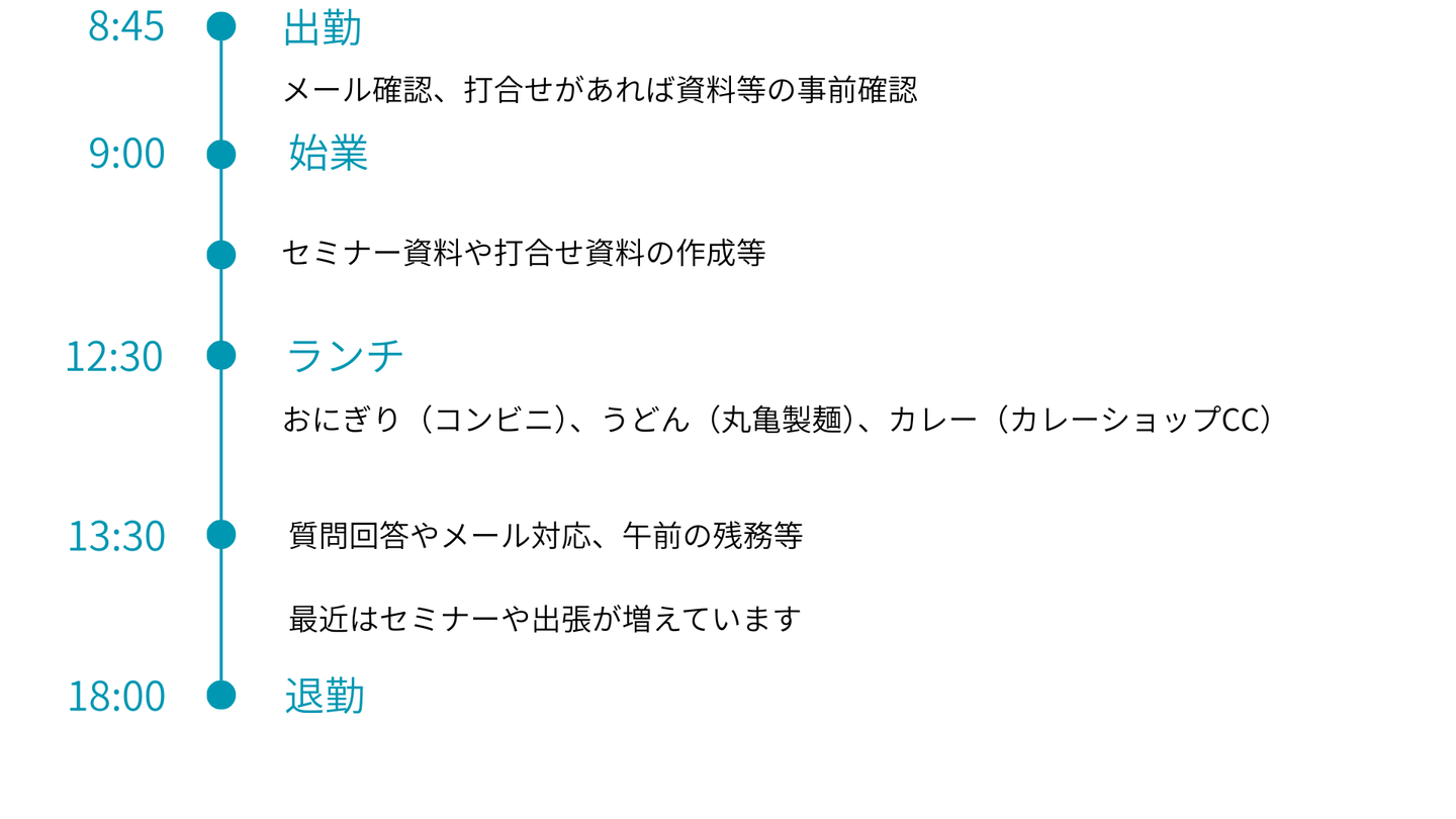 最初は上司(子安さん、原さん)のセミナーに同席して、聞いて学ぶところからでした。