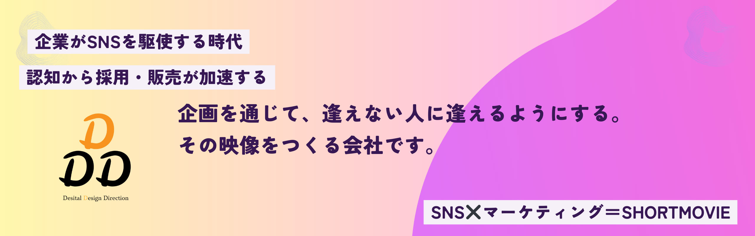 2022年に創業した株式会社DDDは「まだ逢えていないお客様に逢うための仕事」という理念を掲げています。 SNSという業界を通じて社員およびお客様の発展に貢献することを目指し ユーザーとのリレーション構築にベストなマーケティング「SNSマーケティング」を起点に、美容室や俳優・歯医者、飲食店など多角的な会社様の事業を支援しています。 日本中の企業が発信元となる【メディア】を作ることを目指し、新しい価値を相互で発見することに取り組んでいます。