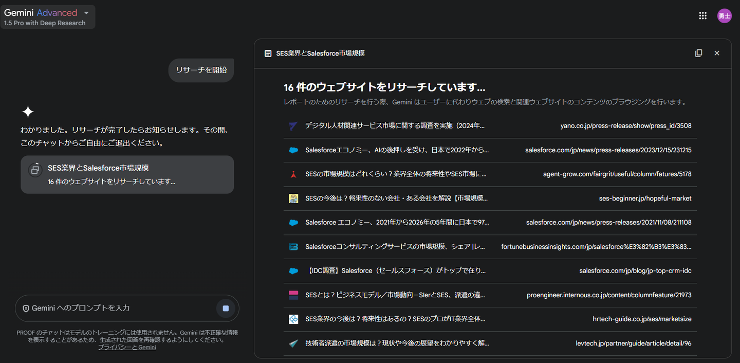 チャットでのやり取りと違い、調査観点を指定し、非常に深いレベルで膨大な情報の中から情報収集と分析を行い、それをレポートにまとめてくれます。