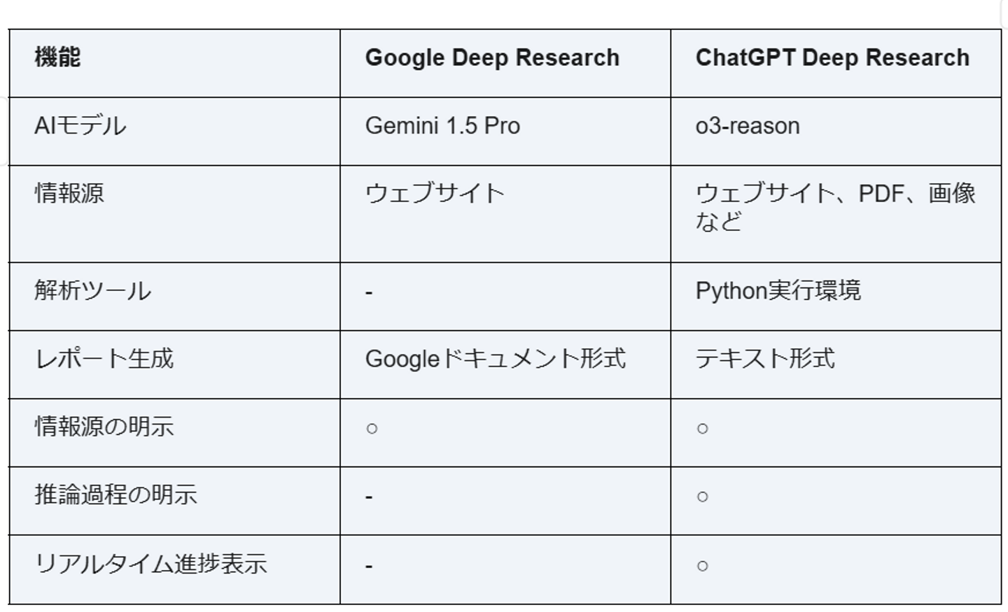 - 分析能力: Google Deep Researchは、Gemini 1.5 Proの高度な言語理解能力により、複雑な文脈を理解し、より深い分析が可能です 3。