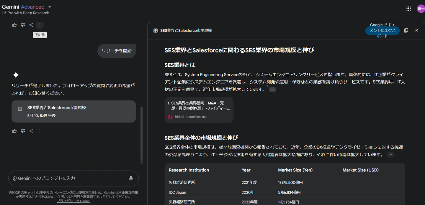 - DeepResearchのレポートは、Googleドキュメントにエクスポートできます。これにより、レポートの共有や編集が容易になり、チームでの共同作業にも適しています。