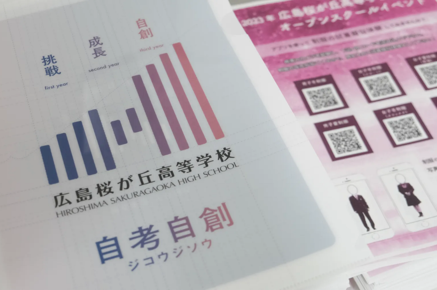 ↑学校の理念である「自考自創」が刻まれたクリアファイル。デザインもクールです