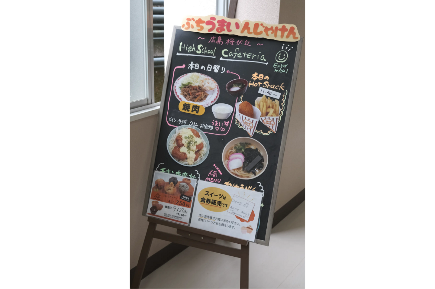 ↑好評の食堂!そのメニュー看板がこちら。左下のマフィンも美味しそう。。