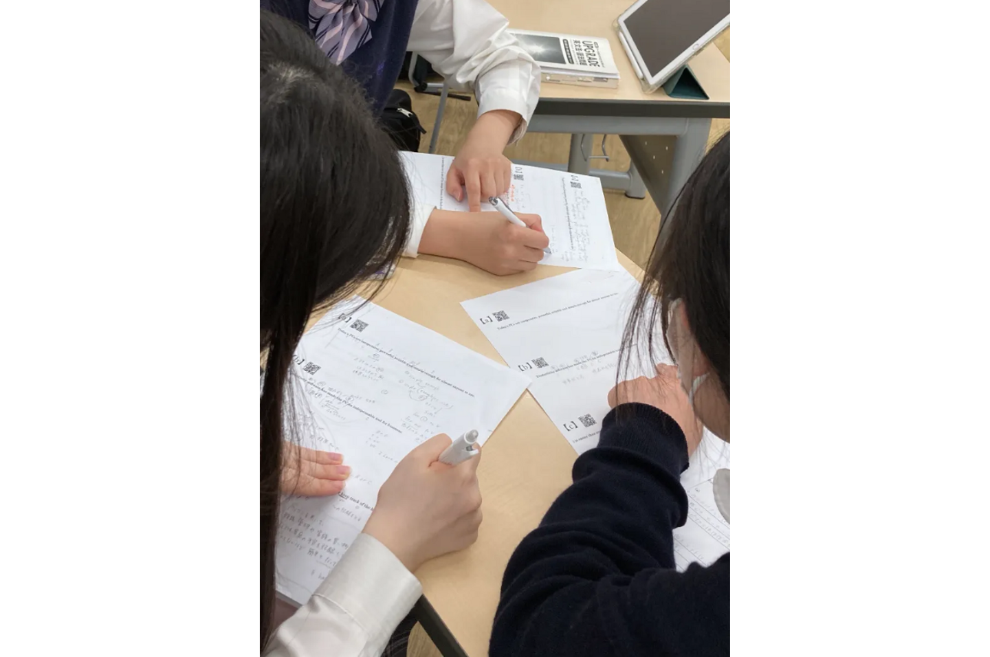 まだまだ試行錯誤の余地あるこの形式(そもそも教育が本質的にそう)ですが、生徒さんたちからは「友達と話し合いながら進めることに比較的好印象をもっている」「グループワークをすることでより理解を深めることができました!」「おかげで嫌いな英語が好きになりつつあります!いつもすごく楽しいです」などなど、前向きなコメントが多々聞かれています。より多くの生徒さんに資するよう、さらに深いグループワーク形式を追究していきます。