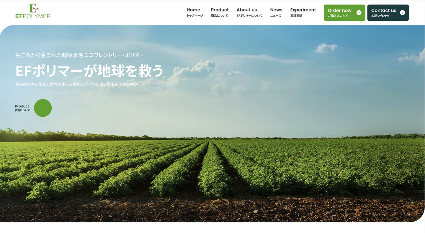 EFポリマーは、最先端技術を駆使した世界の生ゴミ問題と干ばつによる水不足問題の解決から「砂漠緑化」を目標に、現在も研究開発を続けています。また、おむつや生理用ナプキン、アイスパック、携帯用トイレ、化粧品や日用品向けの増粘剤などの農業用途以外への応用についても、積極的に取り組んでいます。
