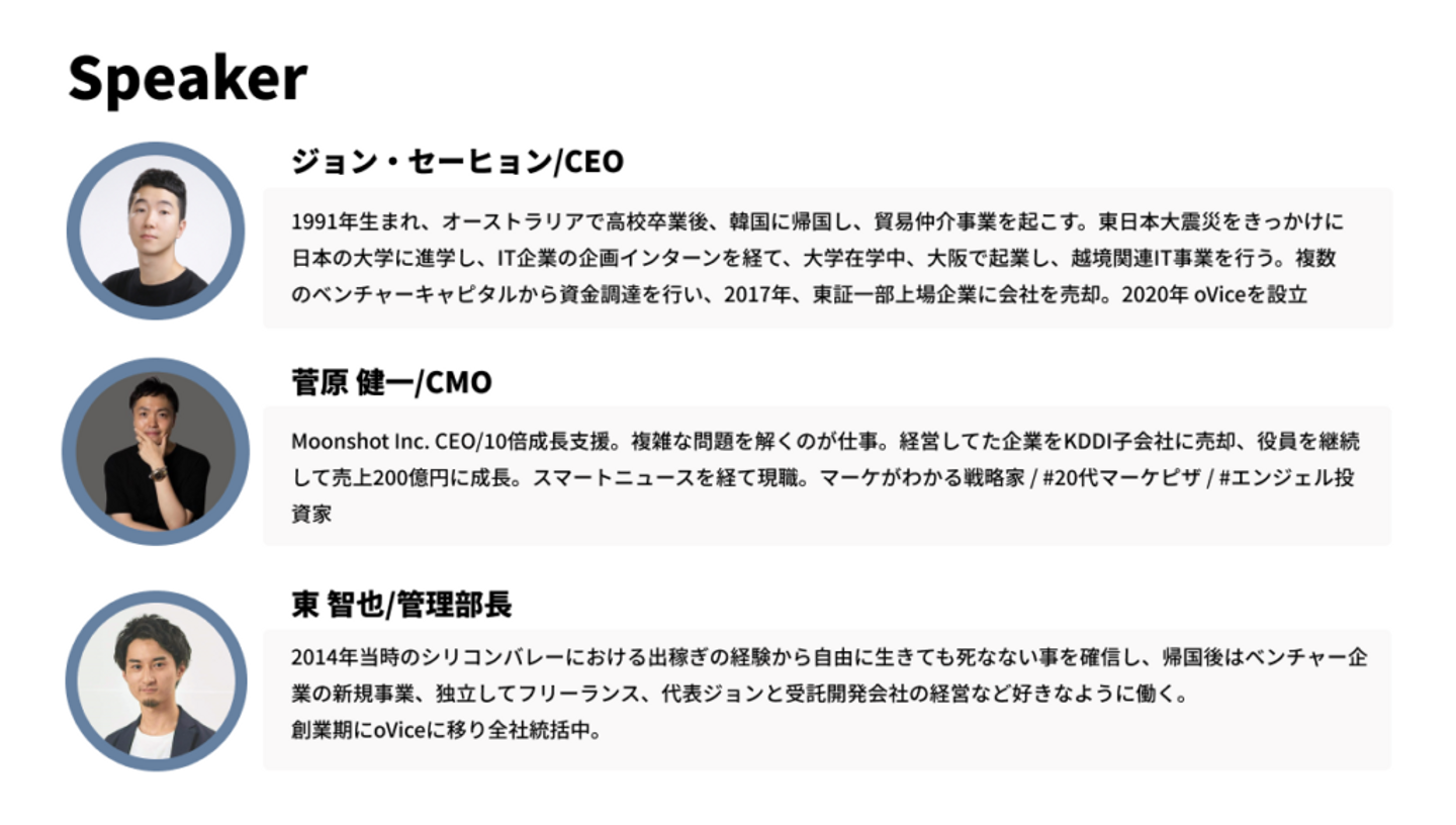 東智也(以下:東):今日はよろしくお願いします。oViceのこれまでとこれからについての話を、CEOのジョン、CMOの菅原と僕の3人で今日は進めていきます。Slidoからいただいた参加者みなさんからの質問も随時拾っていくので、質問もお待ちしています。