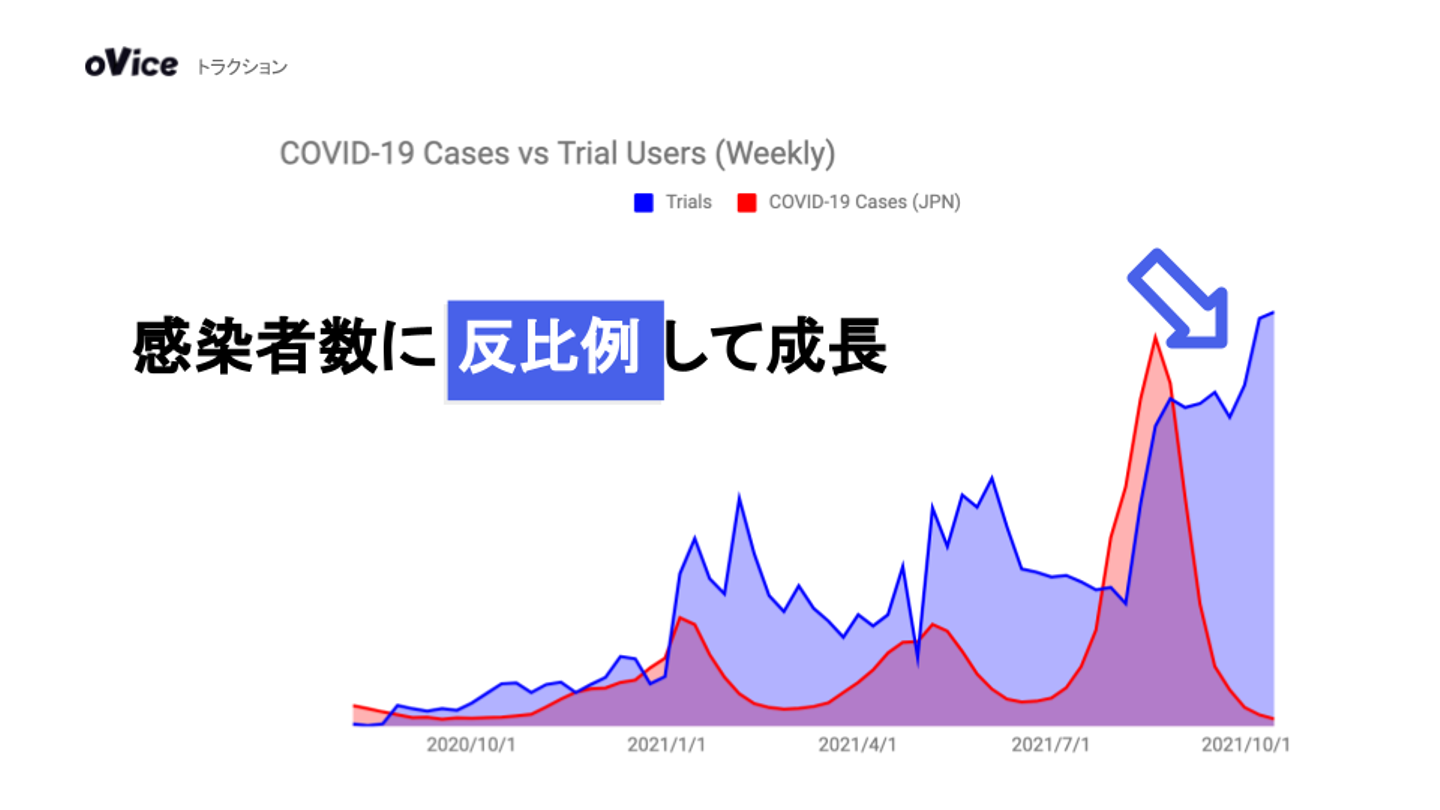 「サービス成長の背景としてコロナ禍影響によるものが大きいのでは」という声をよくいただくのですが、もちろんきっかけの一つではありつつも、感染者数が減り、出社に戻る会社が出始めている今、oViceは過去最大の成長率を更新し続けています。