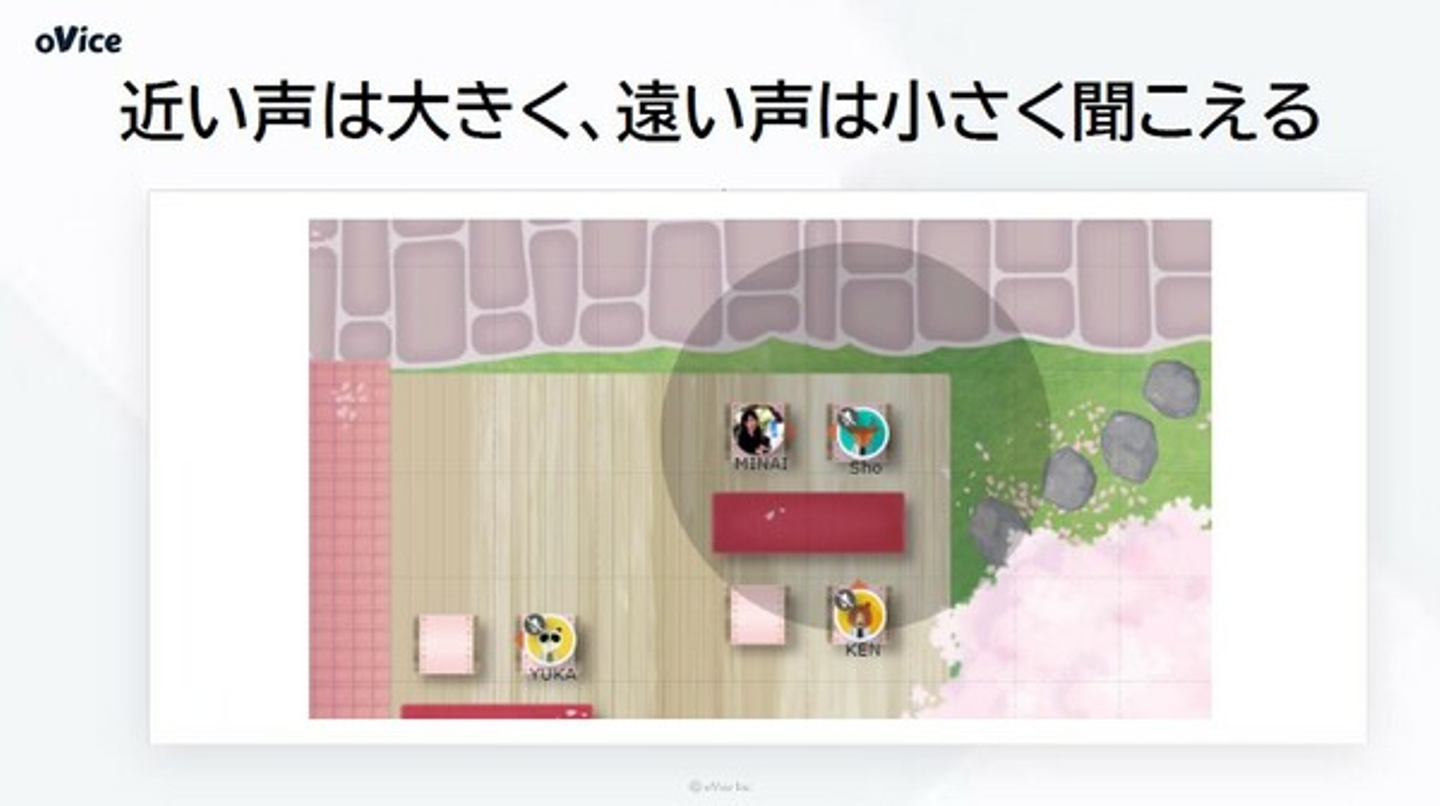 近くにいる人の声は大きく聞こえ、遠くにいる人の声は小さく聞こえる。そんな「距離」の概念を取り入れているのが特徴で、自分のアバターを動かしながらコミュニケーションを取ることができます。