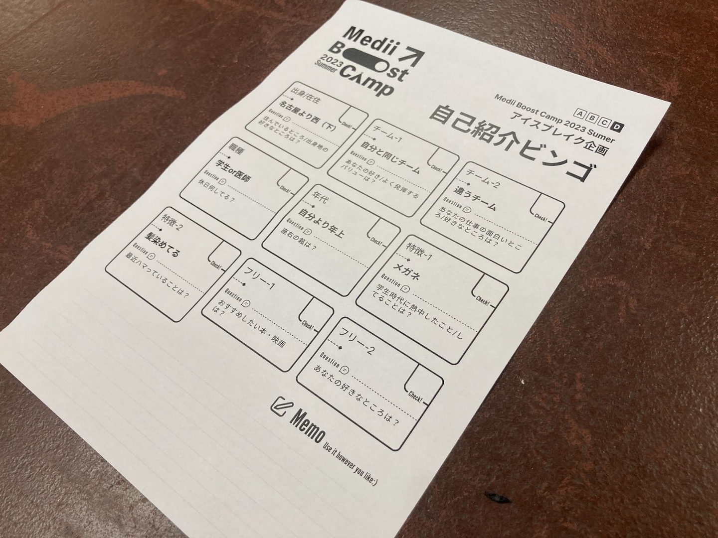 自己紹介カードが各自に配られ、記載された条件にあう相手を時間内に見つけ出すことでカードを完成させるマッチング形式です。「自分より年上」「自分より身長が高い」「左利き」など、それぞれの条件にあうメンバーを一生懸命みつけようとする面々。