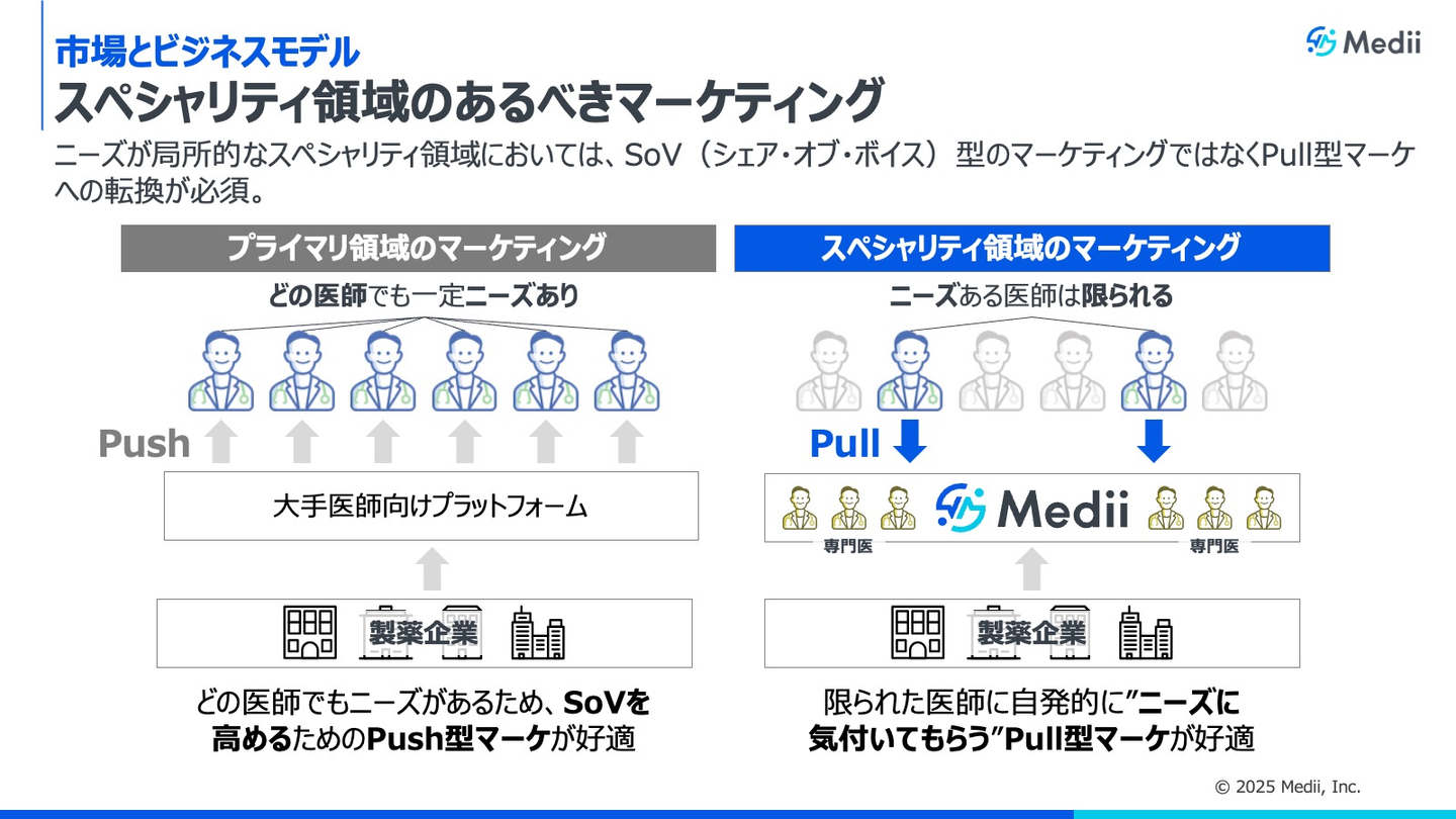 市場が変われば、戦略や手法が変わります。従来のプライマリ医薬品をメインフォーカスとしたPush型では太刀打ちできない部分が増えていて、代わりにMediiが得意とするPull型、つまり医師一人ひとりの行動変容を促すモデルが注目されていると感じています。