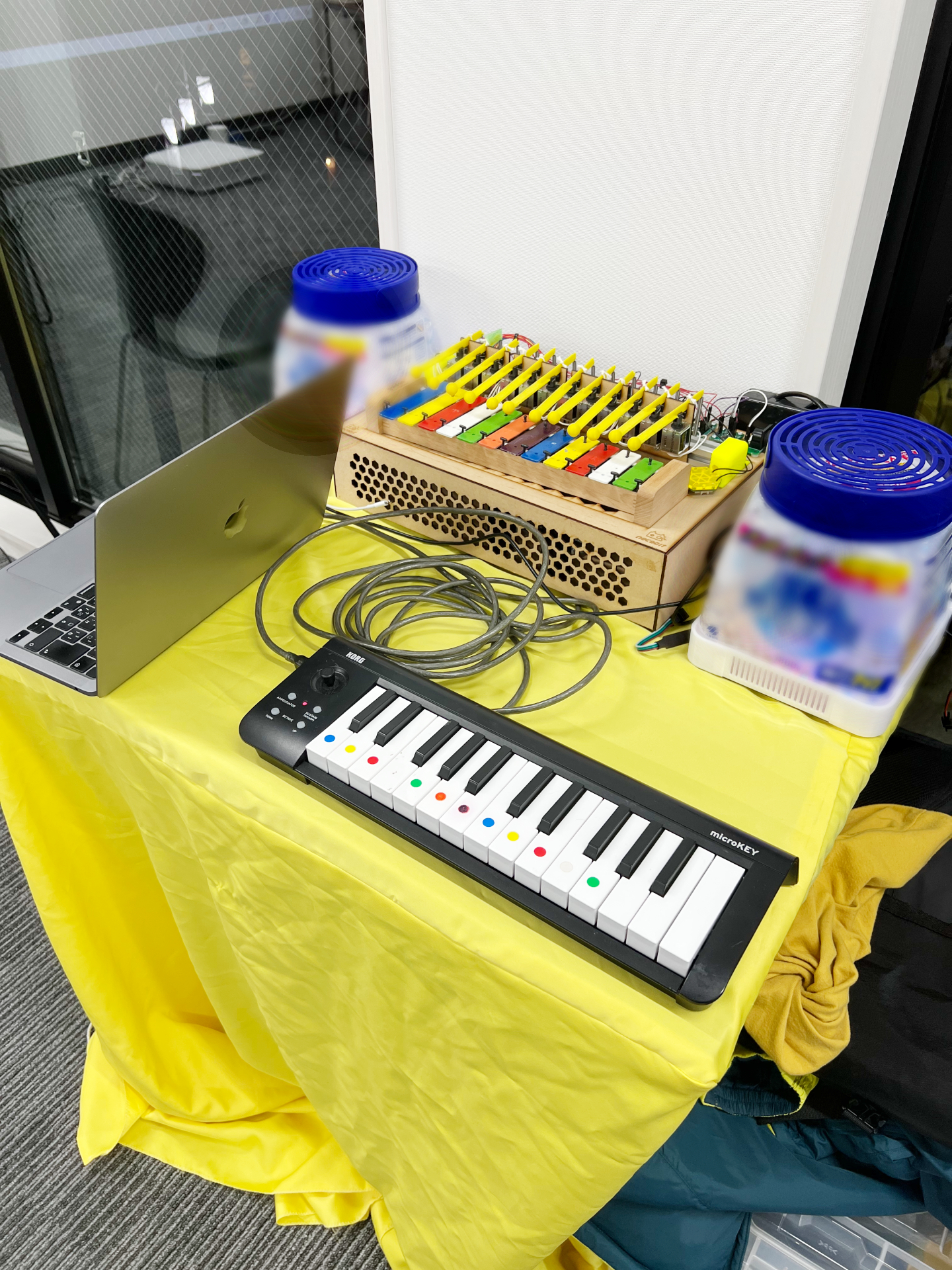 ▼なんでも光らせることに生きがいを感じる業務委託の黄色いエンジニアさんが開発し持参してくれた、音楽が流れ、演奏し、光る消臭システム。