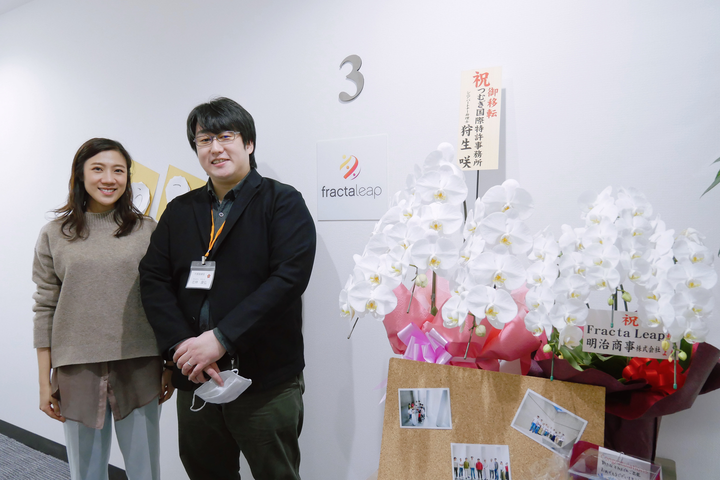 ▼エントランスにて談笑しているところをパシャリ。(左:NovolBa代表 鄧(トウ)様、右:Fracta Leap CEO 北林)