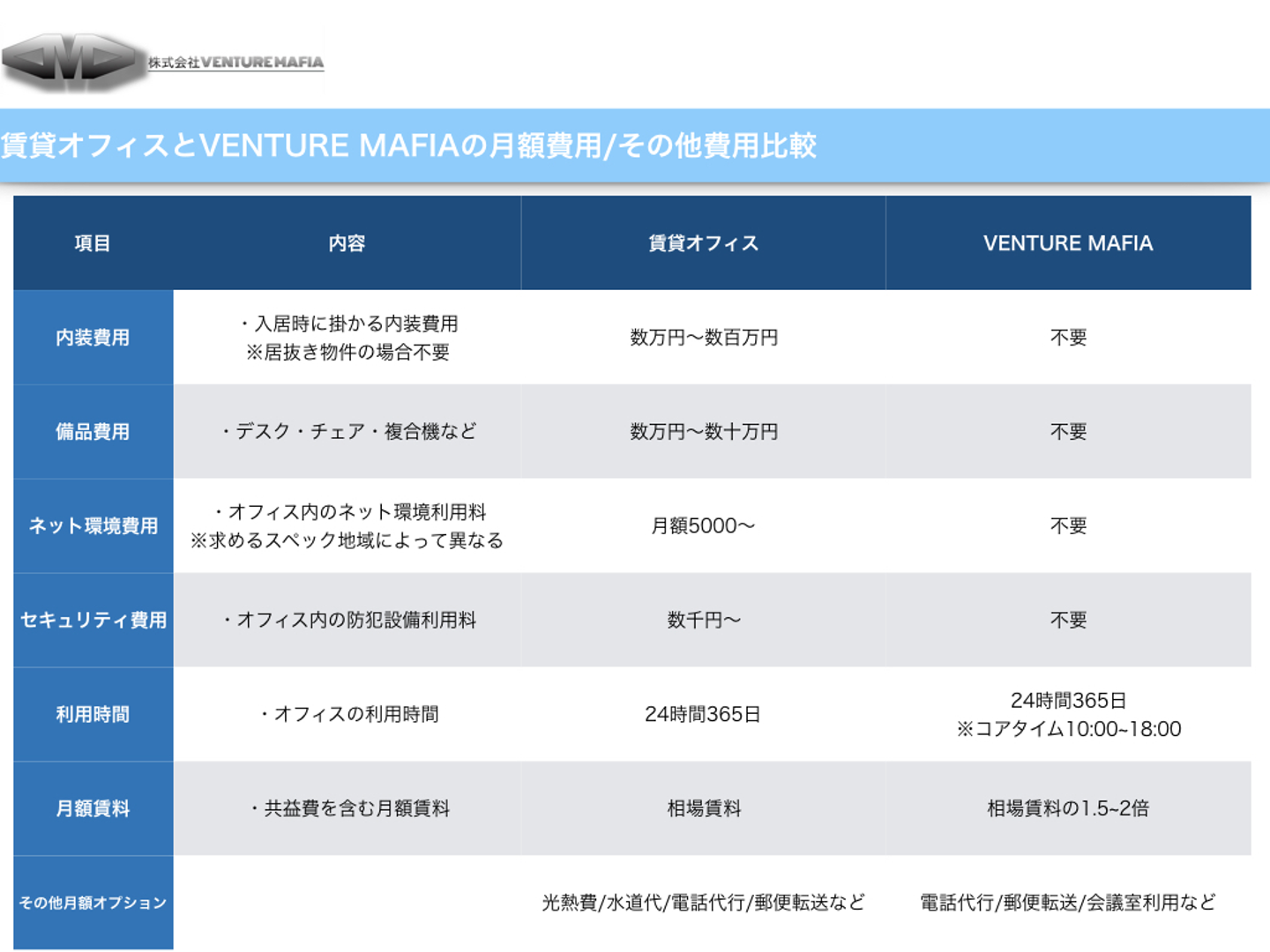「VENTURE MAFIA」はこだわり抜いた内装と設備を提供することで企業が成長しやすい環境を目指すスタートアップです。現在は2020年3月の一号店オープンに向け準備中です。