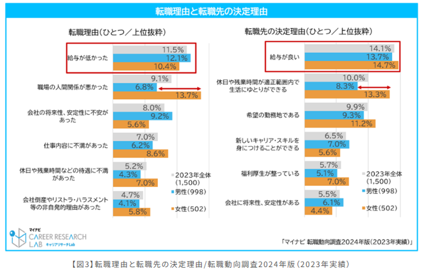 株式会社マイナビの『転職動向調査2024年版』によると、男女で差があるものの、総合理由の第1位は「給与が低かった」(男性:12.1%、女性:10.4%)でした。そのため、転職先の決定理由の第一位も「給与が良い」(男性:13.7%、女性:14.7%)で、最も重視される結果となっています。更に、決定理由の総合2位は「休日や残業時間が適正範囲内で生活にゆとりができる」(男性:8.3%、女性13.3%)がランクインしており、お金や私生活のゆとりを求める理由が強いものの、意外にも総合第3位には「希望の勤務地である」(男性:9.3%、女性:11.2%)がランクインしています。