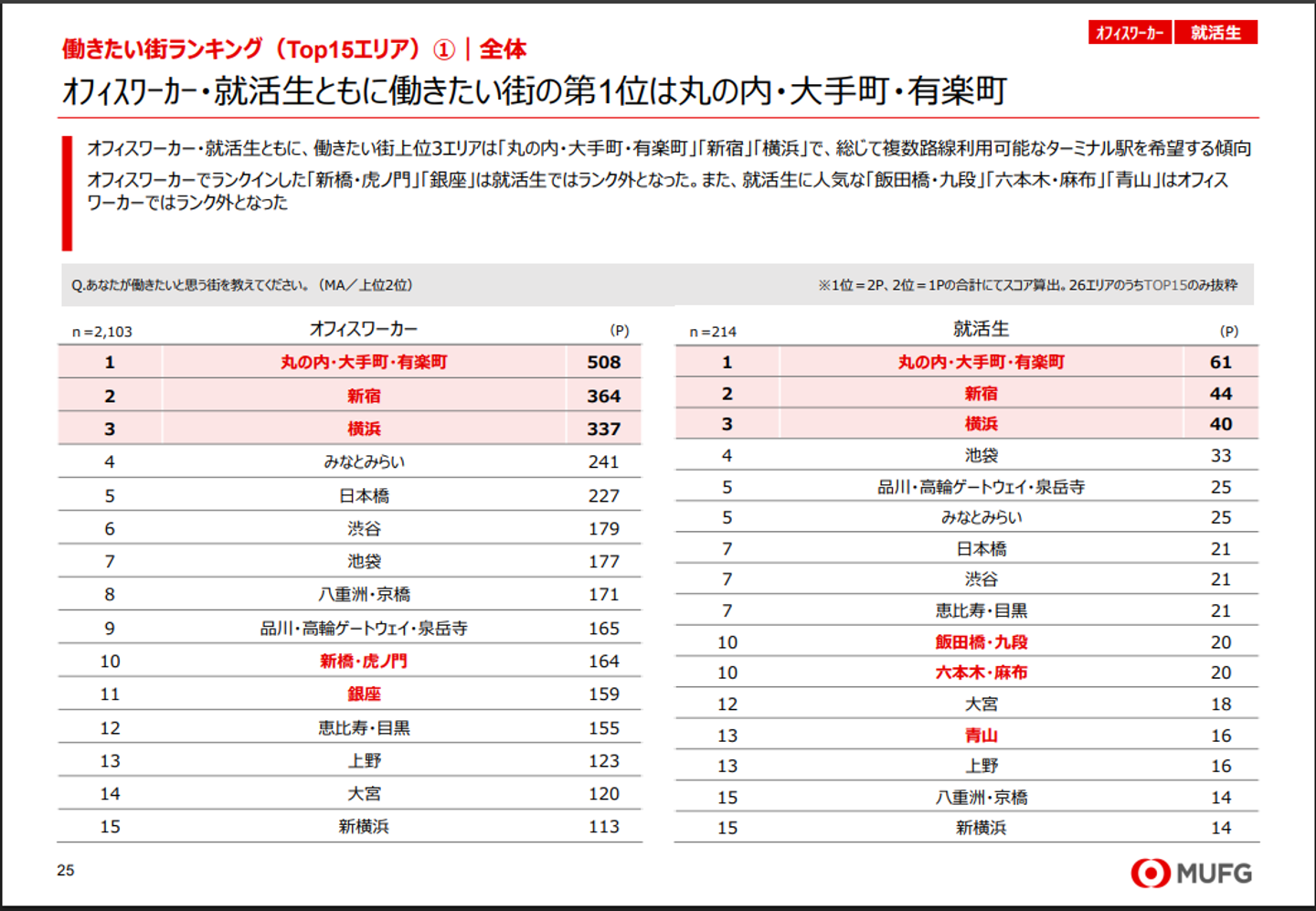 三菱UFJ信託銀行が2024年11月28日~12月1日に調査した『働きたいオフィス・働きたい街ランキングに関する生活者調査』によると、第1位は「丸の内・大手町・有楽町」でした。