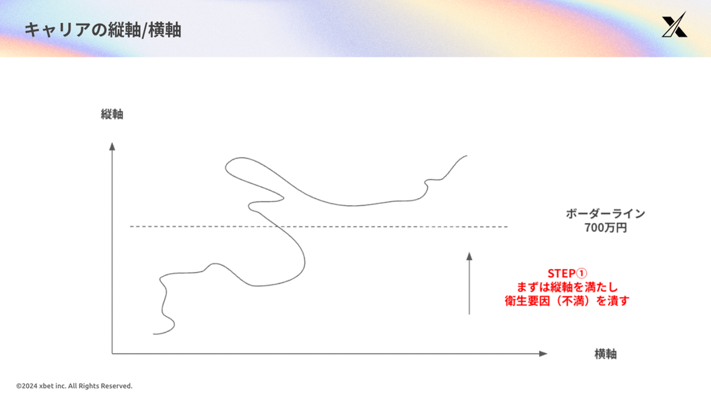 縦軸、つまり年収やポジションにはキリがありません。上を見れば無限に存在します。そこで大切なのが、「これだけはクリアしたい」というボーダーラインを決めることです。