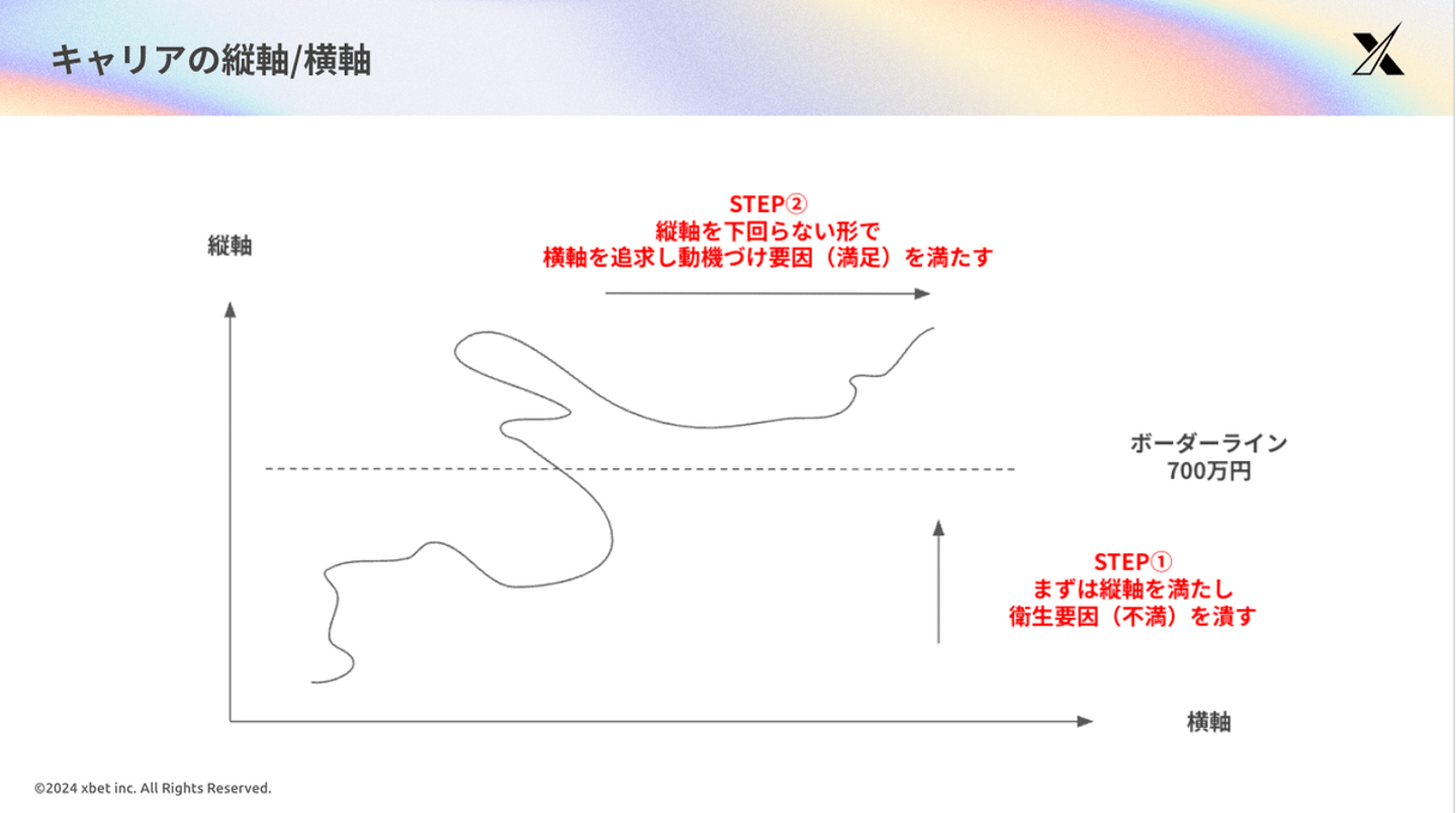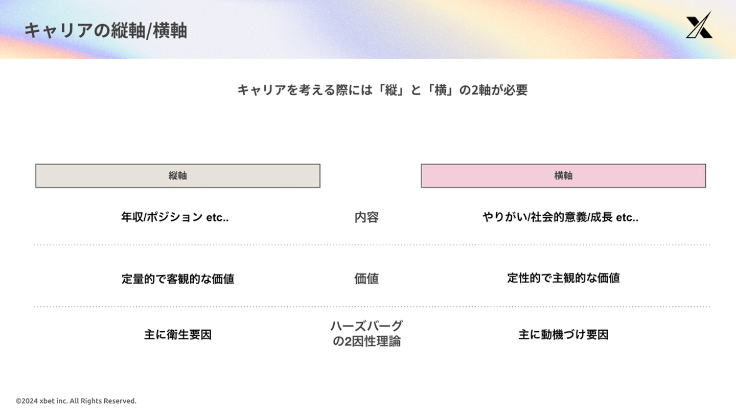 この「二要因理論」は、キャリアプランニングに当てはめることもできます。その際、私たちはキャリアを「縦軸」と「横軸」の2つで整理することを推奨しています。