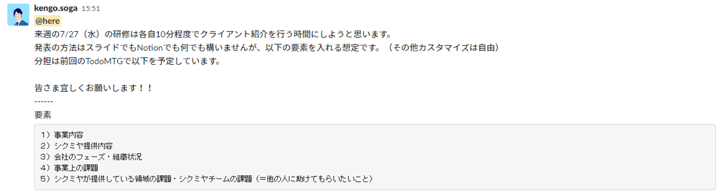 メンバーに広範な知識やスキルを身に着けて欲しいというのも研修を行う目的ですが、コンサルティングファームである以上、メンバーがプレゼンスキルや教えるスキルを磨くことが研修の最大の狙いでもあります