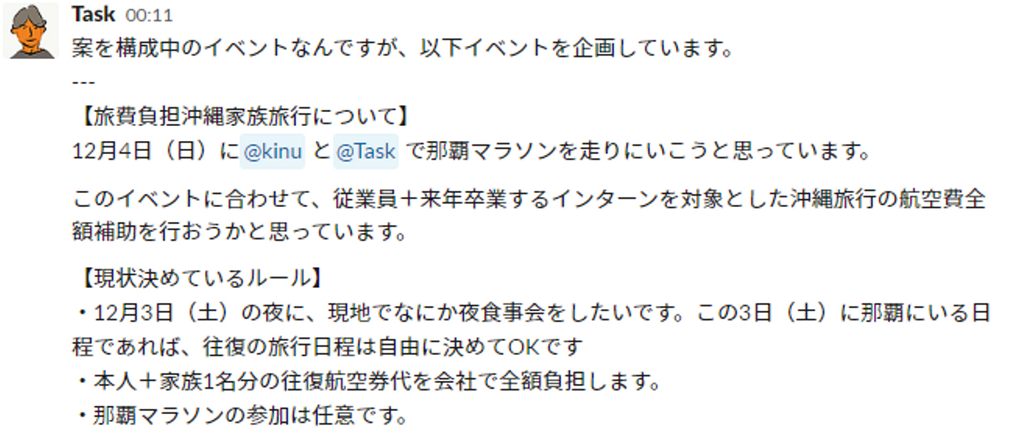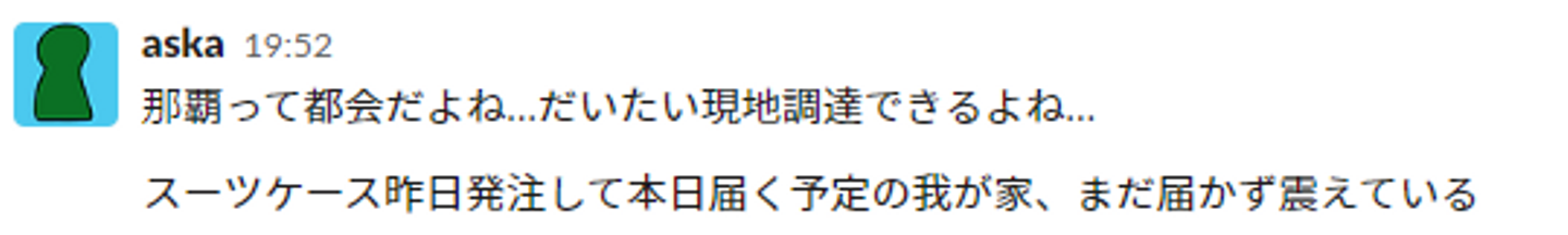 と、以上のメッセージを真夜中にSlackへ投下。よく読むと、合宿ではなくまさかの那覇マラソンにぶつけた沖縄旅行!しかも家族1名分の航空券代負担付!育児や家族が…という理由がなくなった途端、フルリモートの菅沼主導でシクミヤ沖縄旅行の計画が進められることになりました。