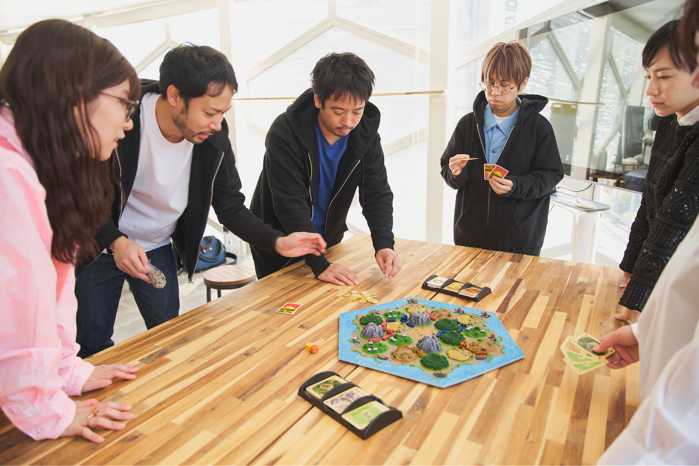 後ろが散らかっていて申し訳ありません…。そしてこの散らかった環境で和むメンバー達。シクミヤは大学の研究室のような雰囲気があります。大量の資料と書籍、データを読み込み仮説を組み立てる姿勢をサポートする環境、そしてインターン生や社外の人たちが出入りすることで醸成される雰囲気。まるで大学の研究室のような雰囲気と香りがします。いい意味でシクミヤのオフィスは「オフィス感」がありません。ボードゲームは山ほどあるし、常にどなたからか頂いたお酒やスナックがある。ゲームのコントローラーも置かれていて、忘年会では皆が大はしゃぎでマリカーをする。言葉通り、探求心と知的好奇心を持った大学生が集まるような雰囲気を持ったオフィスです。