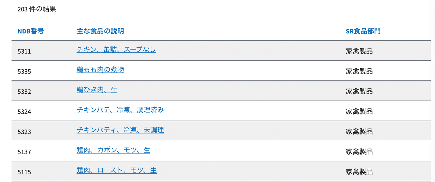 鶏肉だけでも200件を超えるデータベース登録があります