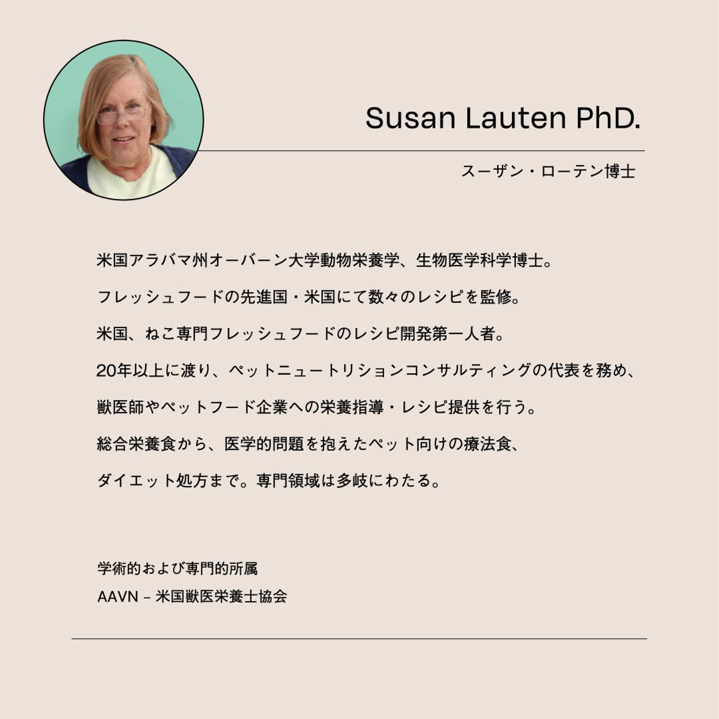 ユニアムは、米国で20年以上にわたりペットフード企業や獣医へ栄養指導を行うスーザン博士にレシピ監修を依頼しました。