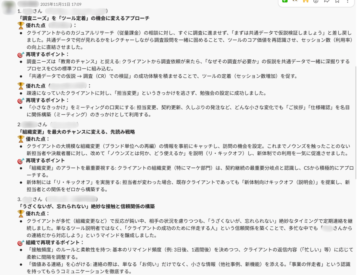 そこで定着したのが、第三者が仲間の活躍を紹介する「他己紹介」の文化です。例えば、マネージャーである落合は、メンバーとの1on1で吸い上げた「隠れた工夫」や「小さな成功」を、マネージャーの視点で全体チャットに共有します。「〇〇さんがこんな素晴らしい対応をしていました!」と発信することで、本人が謙遜して言わない成果にもスポットライトが当たります。